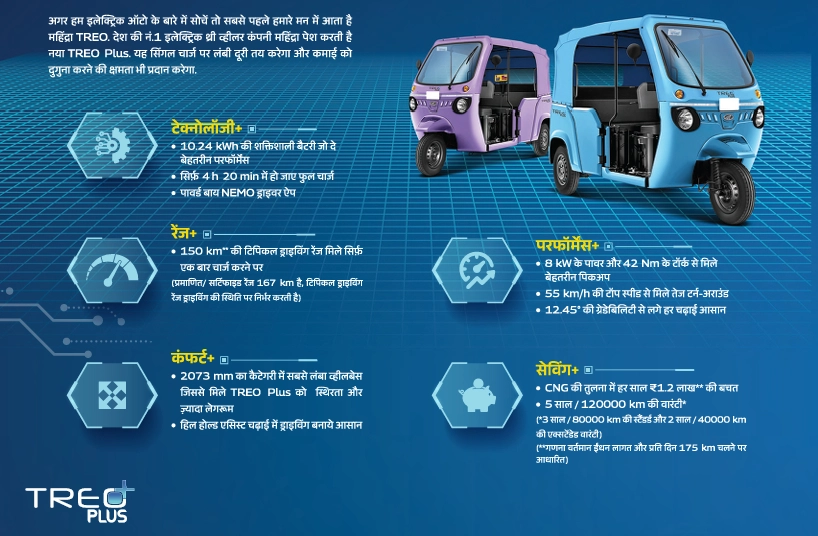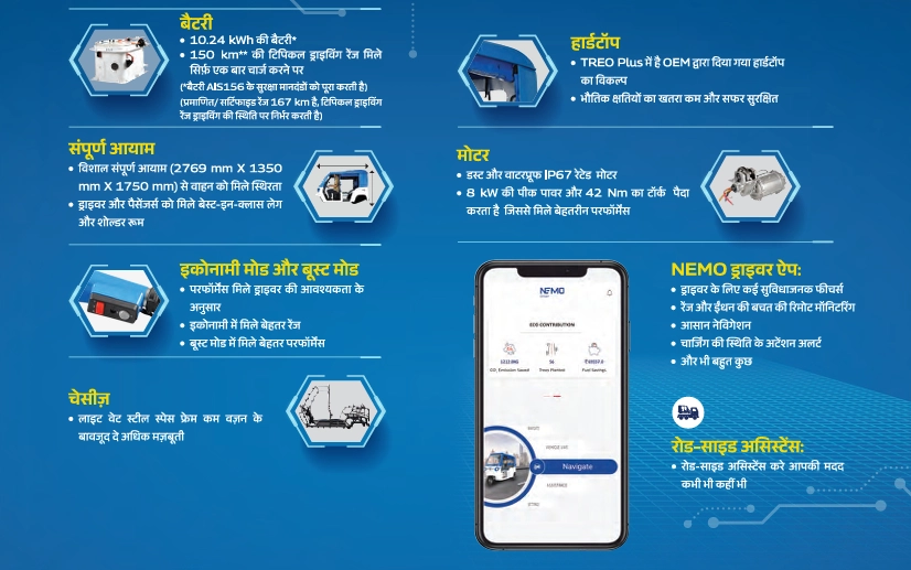 भारत की प्रमुख इलेक्ट्रिक थ्री-व्हीलर कंपनी महिंद्रा लास्ट माइल मोबिलिटी लिमिटेड (MLMML) ने अपने ग्राहकों की बढ़ती ज़रूरतों को पूरा करने के लिए एक नया वाहन पेश किया है - ट्रियो प्लस (Treo Plus) मेटल बॉडी. यह नया मॉडल ग्राहकों की प्रतिक्रिया और सुझावों के आधार पर बनाया गया है, जो MLMML की ग्राहक संतुष्टि के प्रति प्रतिबद्धता को दर्शाता है.