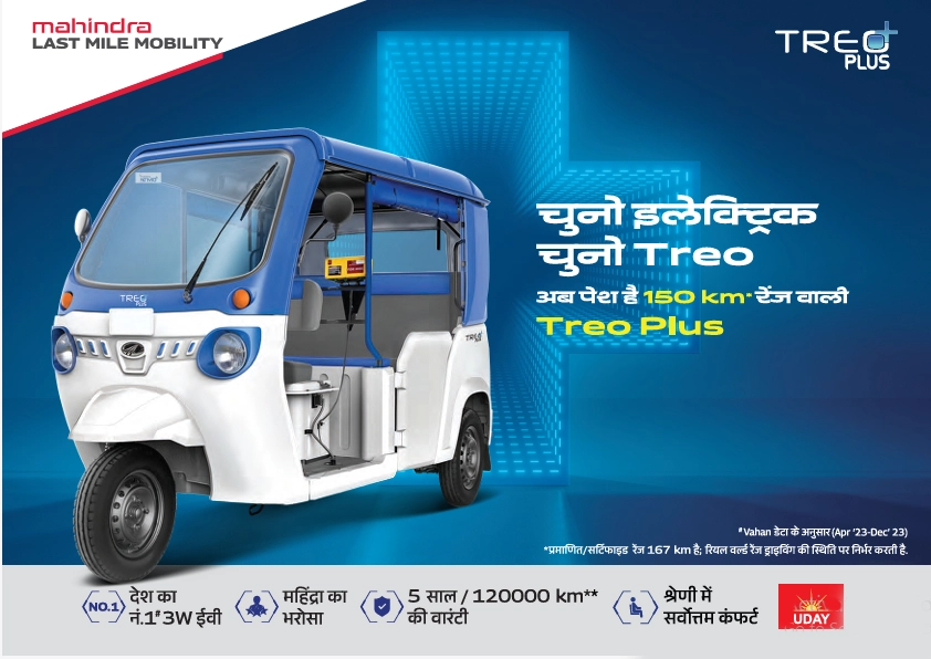 Mahindra Last Mile Mobility Limited ने UDAY प्रोग्राम के तहत Treo खरीदारों को पहले साल के लिए 10 लाख रुपये का दुर्घटना बीमा कवर भी प्रदान किया है. यह पहल ग्राहक सुरक्षा और संतुष्टि के प्रति Mahindra की प्रतिबद्धता को दर्शाती है.