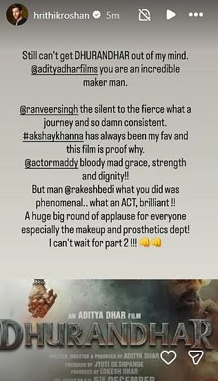 ‘वॉर 2’ के एक्टर ने लिखा, ‘अभी भी धुरंधर मेरे दिमाग से नहीं निकल रही है. @AdityaDharFilms आप एक जबरदस्त मेकर हैं. @RanveerOfficial शांत से लेकर जोशीले तक, क्या सफर है और कितने कंसिस्टेंट हैं. #akshayekhanna हमेशा से मेरे फेवरेट रहे हैं और यह फिल्म इस बात का सबूत है. @ActorMadhavan कमाल की ग्रेस, ताक़त और डिग्निटी!! लेकिन यार @rakeshbedi आपने जो किया वह जबरदस्त था.. क्या एक्टिंग है, शानदार!! सभी के लिए, खासकर मेकअप और प्रोस्थेटिक्स डिपार्टमेंट के लिए जोरदार तालियां! मैं पार्ट 2 का इंतज़ार नहीं कर सकता!!! यह भी पढ़ें: Dhurandhar Movie Review: रणवीर सिंह का धमाल, दमदार एक्शन और रोमांच से भरपूर जासूसी ड्रामा