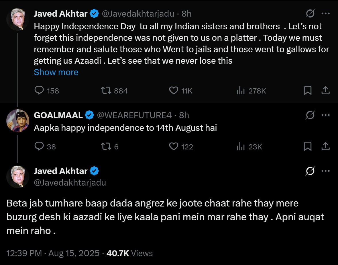 बॉलीवुड के प्रख्यात गीतकार, कवि और पटकथा लेखक जावेद अख्तर (Javed Akhtar) ने भारत के 79वें स्वतंत्रता दिवस के अवसर पर देशवासियों को शुभकामनाएँ दीं. इस दौरान उन्होंने यह याद दिलाना भी ज़रूरी समझा कि स्वतंत्रता थाली में परोस कर नहीं मिलती, बल्कि यह अनगिनत स्वतंत्रता सेनानियों के बलिदान से अर्जित की गई है. जावेद अख्तर की इस पोस्ट पर एक इस्लामोफोबिक ट्रोल ने तंज कसते हुए कहा कि उन्हें 14 अगस्त को अपना ‘स्वतंत्रता दिवस’ मनाना चाहिए. (ज्ञात हो कि पाकिस्तान 14 अगस्त को और भारत 15 अगस्त को स्वतंत्रता दिवस मनाता है.) ट्रोल के इस बयान पर जावेद अख्तर ने हिंदी में करारा जवाब दिया: "बेटा, जब तुम्हारे पूर्वज अंग्रेजों के जूते चाट रहे थे, मेरे पूर्वज देश की आज़ादी के लिए काला पानी में मर रहे थे. अपनी हद में रहो."इस जवाब में ‘काला पानी’ का उल्लेख अंडमान द्वीप समूह की कुख्यात सेलुलर जेल के लिए था, जहां ब्रिटिश शासन के दौरान आज़ादी के दीवानों को अमानवीय परिस्थितियों में कैद किया जाता था. यह भी पढ़ें: Shilpa Shetty- Raj Kundra Meet Premanand Maharaj: शिल्पा शेट्टी और राज कुंद्रा ने प्रेमानंद जी महाराज से की मुलाक़ात, बाबा ने कोई नशा न करने की दी सलाह