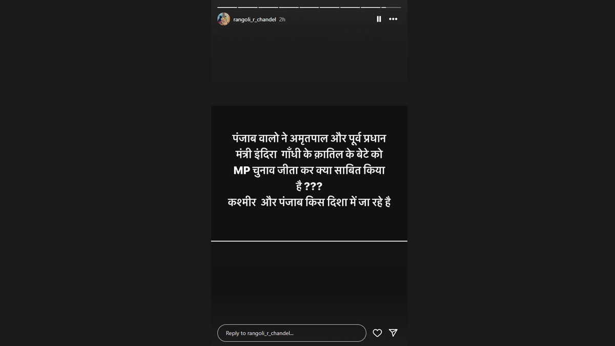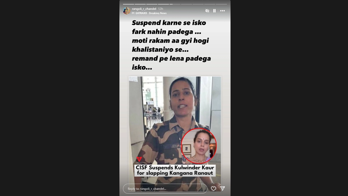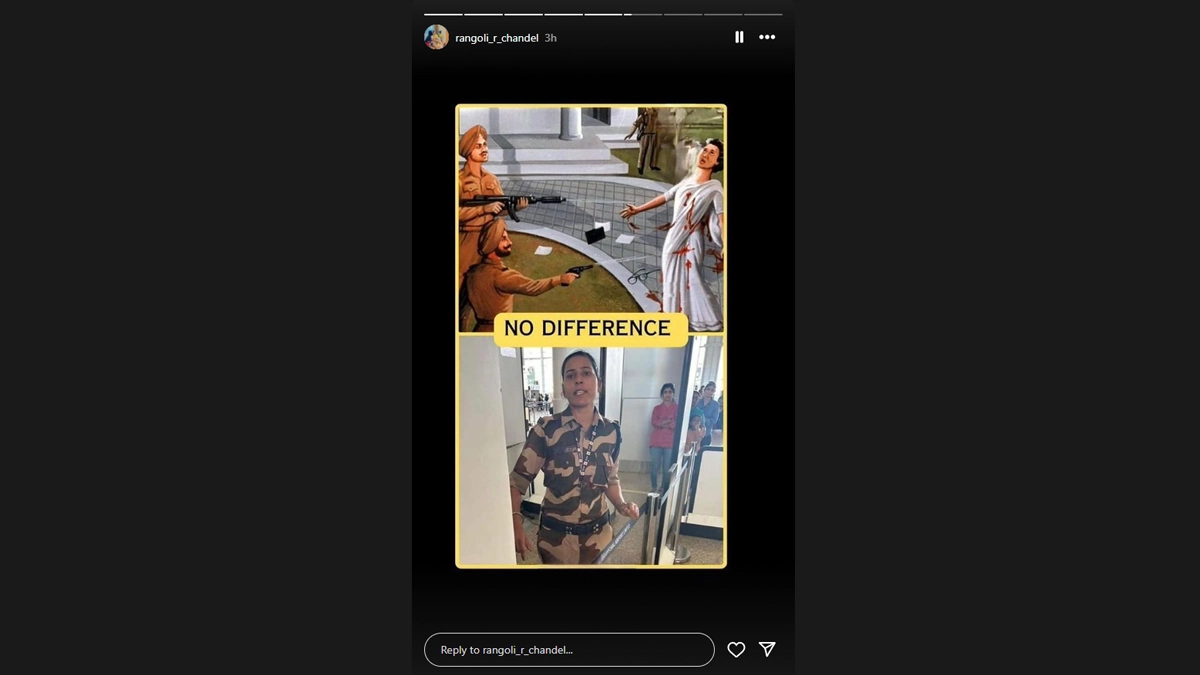 रंगोली चंदेल ने सोशल मीडिया पर कंगना के साथ हुई घटना की तुलना 1984 के सिख दंगों की घटना से की. उन्होंने एक ग्राफिक इमेज साझा की जिसमें इंदिरा गांधी की हत्या के दृश्य को और कथित रूप से कंगना के थप्पड़ मारने वाली CISF कांस्टेबल की तस्वीर को संयोजित किया. एक अन्य पोस्ट में, उन्होंने लिखा, “सस्पेंड करने से इसको फर्क नहीं पड़ेगा...मोटी रकम आ गई होगी खालिस्तानियों से...इसको रिमांड पर लेना पड़ेगा.”
