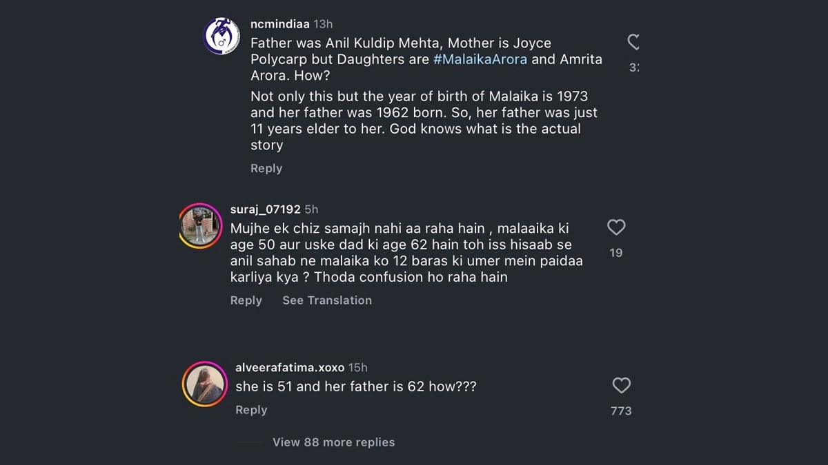 मलाइका अरोड़ा ने अपने पिता की उम्र 62 वर्ष बताई, जो 1962 में जन्मे थे. जबकि मलाइका खुद 50 वर्ष की हैं, जो कि सार्वजनिक रिकॉर्ड्स के अनुसार है. इस 12 साल के अंतर ने प्रशंसकों के बीच कई सवाल खड़े किए, क्या अनिल मेहता उनके असली पिता थे या फिर सौतेले?