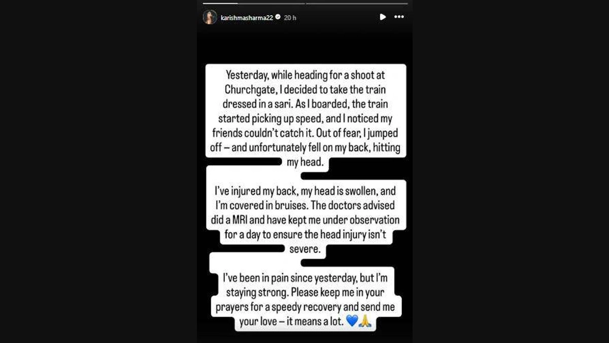 यह घटना उस समय हुई जब करिश्मा एक शूटिंग के लिए चर्चगेट जा रही थीं. अपनी इंस्टाग्राम स्टोरी पर जानकारी साझा करते हुए, अभिनेत्री ने बताया कि उन्होंने यात्रा के दौरान साड़ी पहनने का फैसला किया था, जिससे ट्रेन में चढ़ना मुश्किल हो गया. उन्होंने लिखा- ‘कल, चर्चगेट में एक शूटिंग के लिए जाते समय, मैंने साड़ी पहनकर ट्रेन पकड़ने का फैसला किया. जैसे ही मैं ट्रेन में चढ़ी, उसकी गति बढ़ गई और मैंने देखा कि मेरे दोस्त उसमें नहीं चढ़ पा रहे हैं. डर के मारे, मैं कूद गई और पीठ के बल गिर गई, जिससे मेरे सिर में गंभीर चोट आई.’