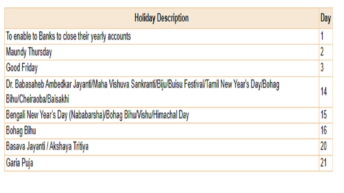 अप्रैल 2026 बैंक छुट्टियों की सूची
