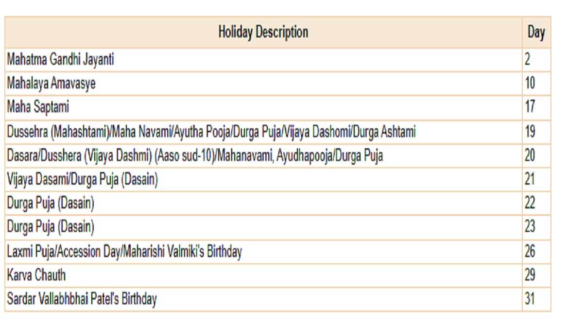 अक्टूबर 2026 बैंक छुट्टियों की सूची