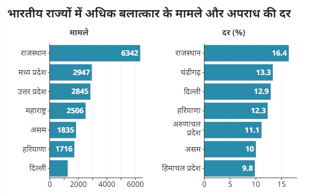 2022 में देशभर में कुल 31,516 बलात्कार के मामले दर्ज किए गए, जिसका अर्थ है कि हर 16 मिनट में एक मामला सामने आया. निम्नलिखित राज्यों में सबसे अधिक मामले दर्ज किए गए: