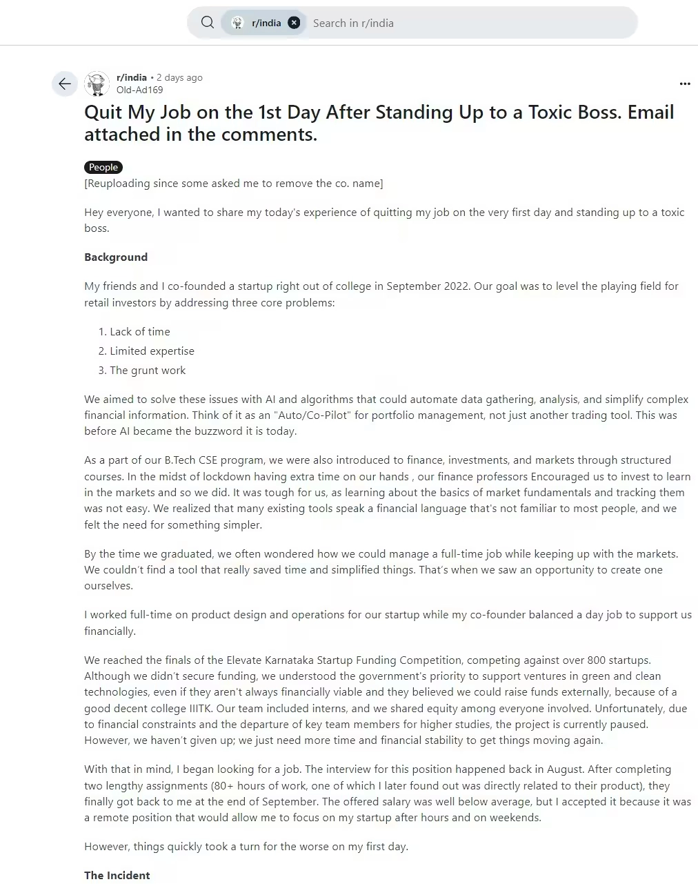 श्रेयस ने Reddit पर अपनी कहानी साझा करते हुए लिखा, "मेरे पहले दिन, 7 अक्टूबर को, मेरे रिपोर्टिंग मैनेजर ने स्पष्ट किया कि वह असामान्य प्रतिबद्धताओं की उम्मीद करते हैं - बिना किसी मुआवजे के सामान्य घंटों के बाद काम करने के लिए." उन्होंने बताया कि जब उन्होंने अपनी सीमाएं स्थापित करने की कोशिश की, तो उनके बॉस ने उनकी इच्छा को हंसकर उड़ा दिया.