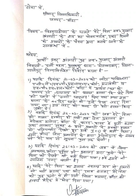 यूपी के माफिया डॉन मुख्तार अंसारी की गुरुवार को मौत हो गई थी. मौत का कारण कार्डियक अरेस्ट बताया गया है. मुख्तार अंसारी के छोटे बेटे उमर अंसारी ने बांदा के डीएम को चिट्ठी लिखकर अपने पिता के शव का पोस्टमार्टम दोबार कराने की याचिका दी है. उमर ने दिल्ली एम्स में दोबारा पोस्टमार्टम कराने को कहा है.