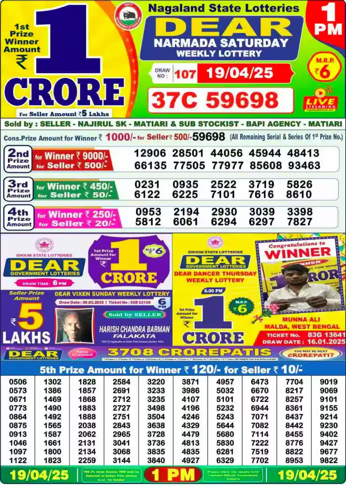 नागालैंड लॉटरी 19-04-2025 शनिवार का पुरस्कार विवरण