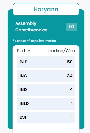 इलेक्शन कमीशन के नवीनतम आंकड़ों के अनुसार, बीजेपी 90 सीटों में से 50 सीटों पर आगे चल रही है, जिससे पार्टी ने बहुमत का आंकड़ा 46 पार कर लिया है. वहीं, कांग्रेस 34 सीटों पर बढ़त बनाए हुए है.इस समय हरियाणा विधानसभा चुनाव के नतीजे तेजी से बदल रहे हैं, और मतगणना जारी है. बीजेपी की इस शानदार बढ़त से उनके कार्यकर्ताओं में उत्साह का माहौल है, जबकि कांग्रेस के लिए यह एक चुनौती साबित हो रहा है.