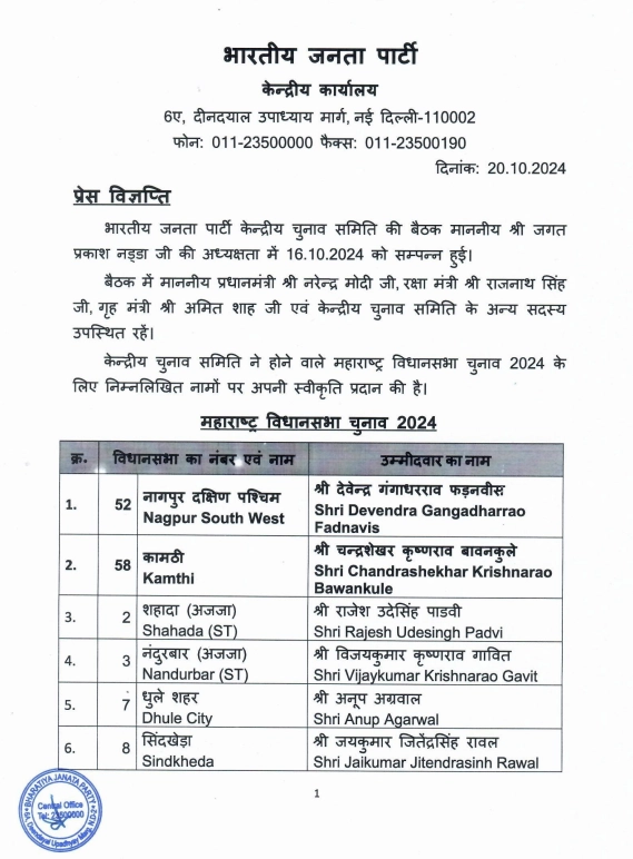 यह सूची राज्य की 288 सीटों पर होने वाले चुनावों के लिए बेहद महत्वपूर्ण मानी जा रही है. मतदान 20 नवंबर 2024 को होगा और नतीजे 23 नवंबर को घोषित किए जाएंगे.