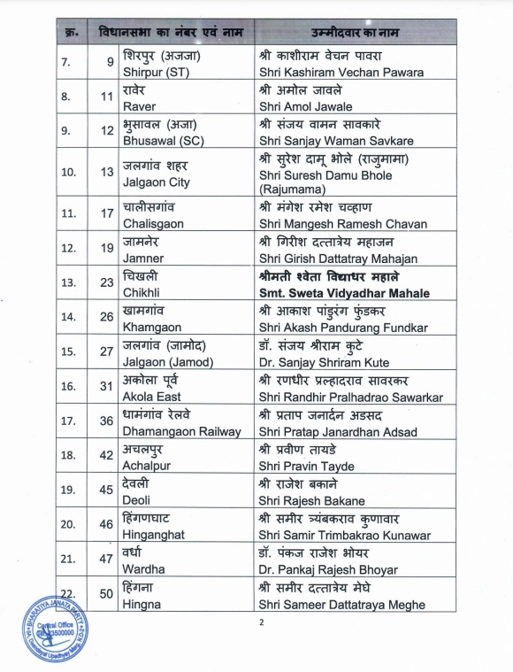 बीजेपी ने शहादा से राजेश उदेसिंह पाडवी को, नंदुरबार से विजयकुमार कृष्णराव गावित को, धुले सिटी से अनूप अग्रवाल को, सिंदखेड़ा से जयकुमार जितेंद्र सिंह रावल, शिरपुर से काशीराम वेचन पावरा, रावेर से अमोल जावले, भुसावल से संजय वामन सावकारे, जलगांव सिटी से सुरेश दामू भोले, चालीसगांव सीट से मंगेश रमेश चव्हाण, जामनेर से गिरीश दत्तात्रेय महाजन, चिखली से श्वेता विद्याधर महाले, खामगांव से आकाश पांडुरंग फुंडकर, जलगांव (जामोद) से संजय श्रीराम कुटे, अकोला ईस्ट से रणधीर प्रल्हादराव सावरकर, धामंगांव रेलवे से प्रताप जनार्दन, अचलपुर से प्रवीण तायडे को टिकट दिया है.