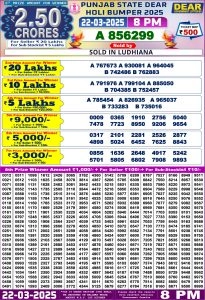 Who Won Punjab State Holi Bumper Lottery 2025: पंजाब स्टेट होली बंपर लॉटरी 2025 का नतीजा घोषित हो चुका है. इस बार पहला इनाम 2.5 करोड़ रुपये का है, जिसे टिकट नंबर A856299 ने जीता है. पंजाब सरकार द्वारा आयोजित इस लॉटरी के अन्य विजेताओं के नाम भी घोषित किए गए हैं. रिजल्ट की आधिकारिक घोषणा आज रात 8 बजे की गई. लॉटरी का परिणाम पंजाब सरकार की आधिकारिक वेबसाइटों punjabstatelotteries.gov.in और punjablotterystore.com पर जारी किया गया है.