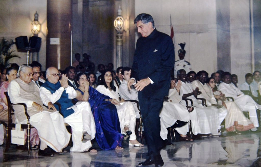 उद्योगपति रतन टाटा भारत के राष्ट्रपति से पद्म भूषण पुरस्कार प्राप्त करने के लिए प्रधानमंत्री अटल बिहारी वाजपेयी के पास से गुजरते हुए. पद्म पुरस्कार भारत के सर्वोच्च नागरिक सम्मानों में से एक है.