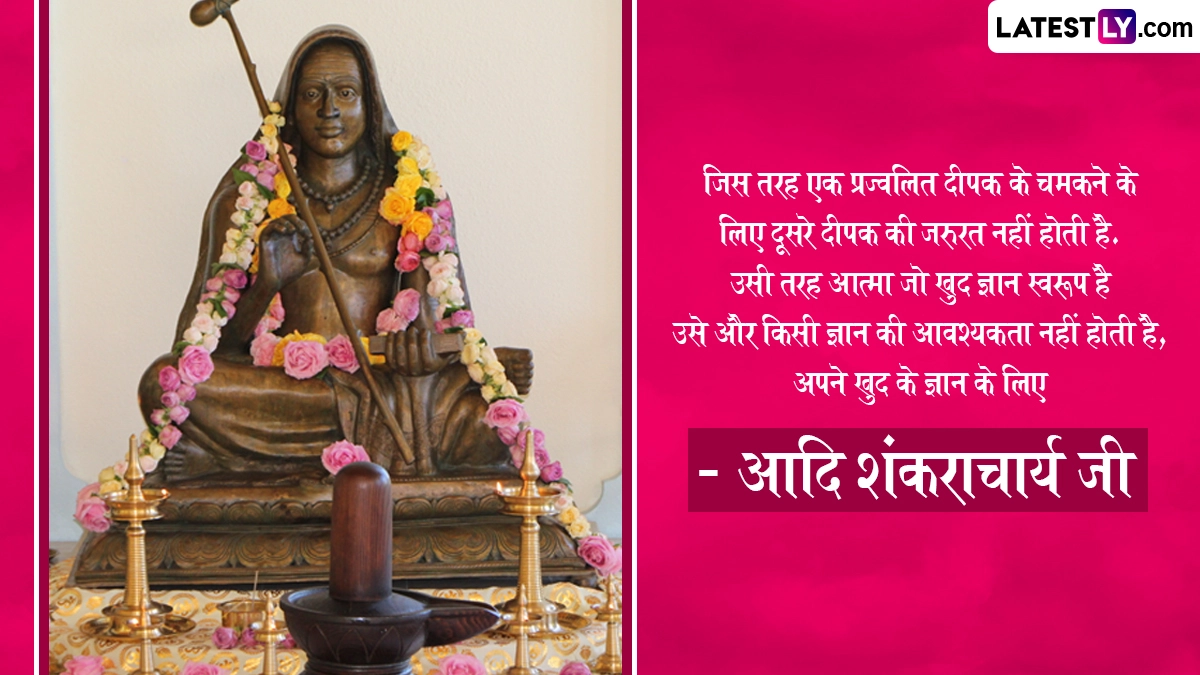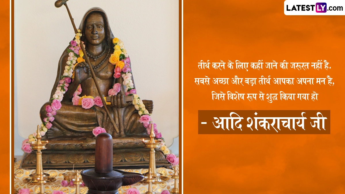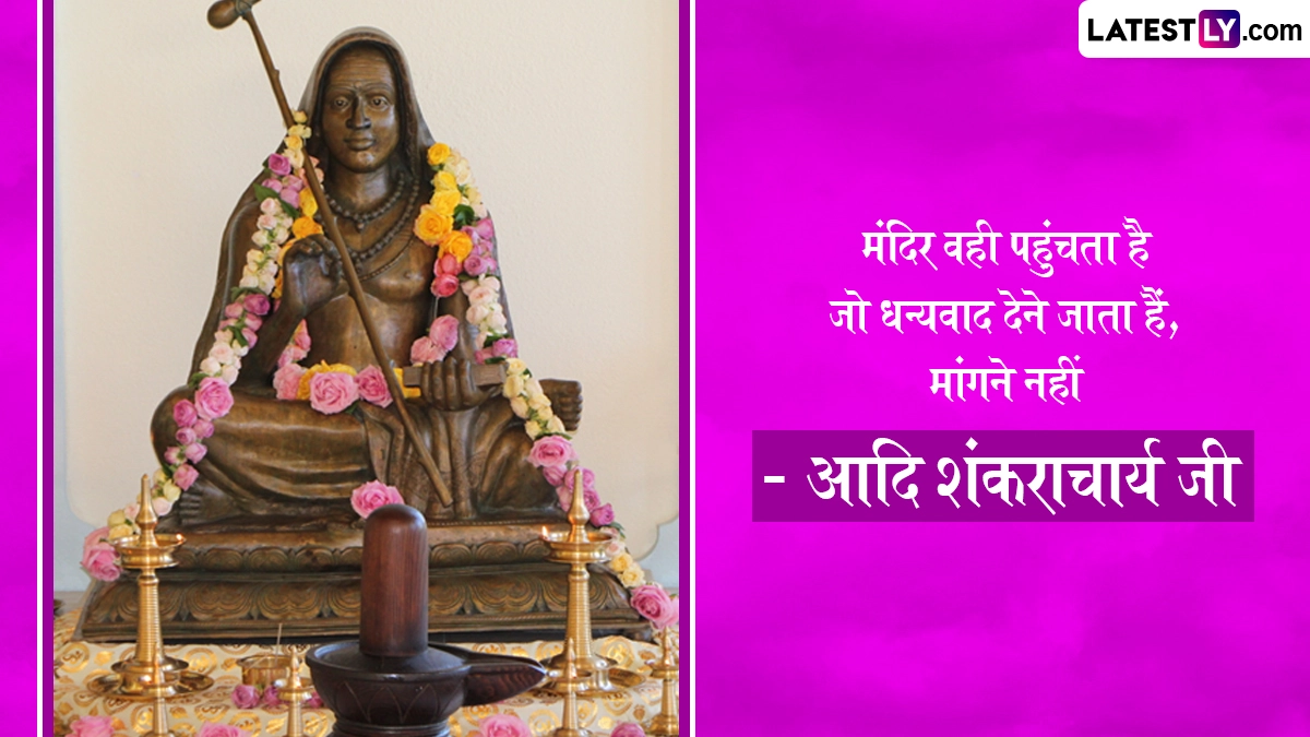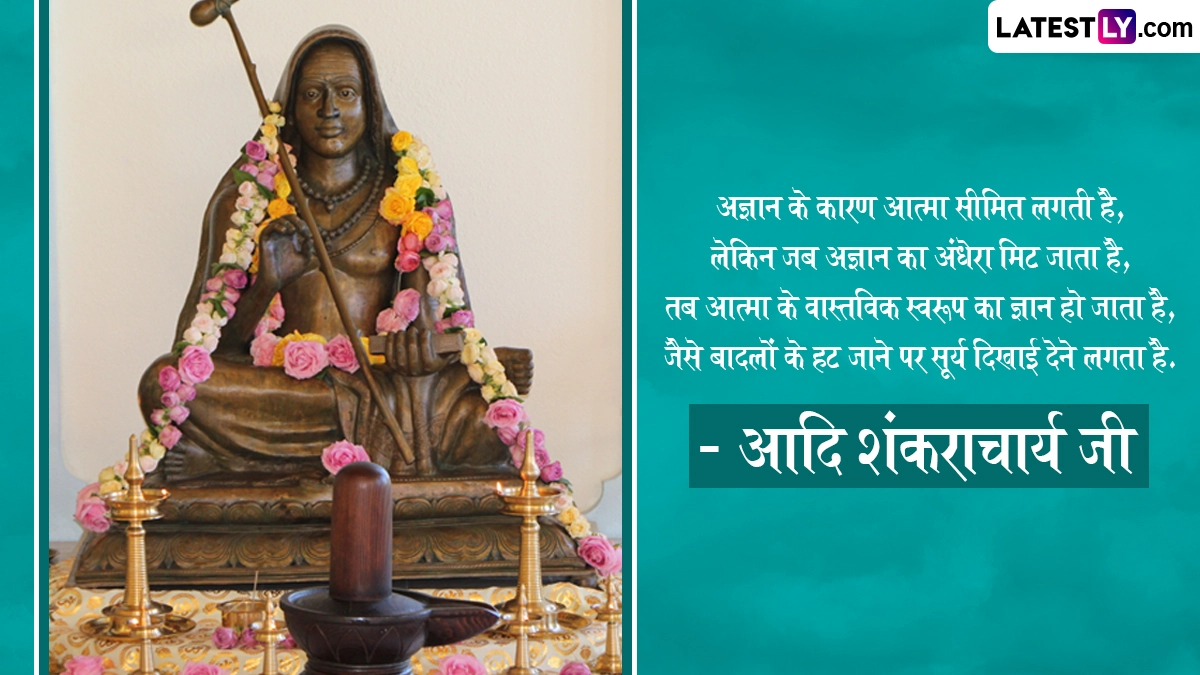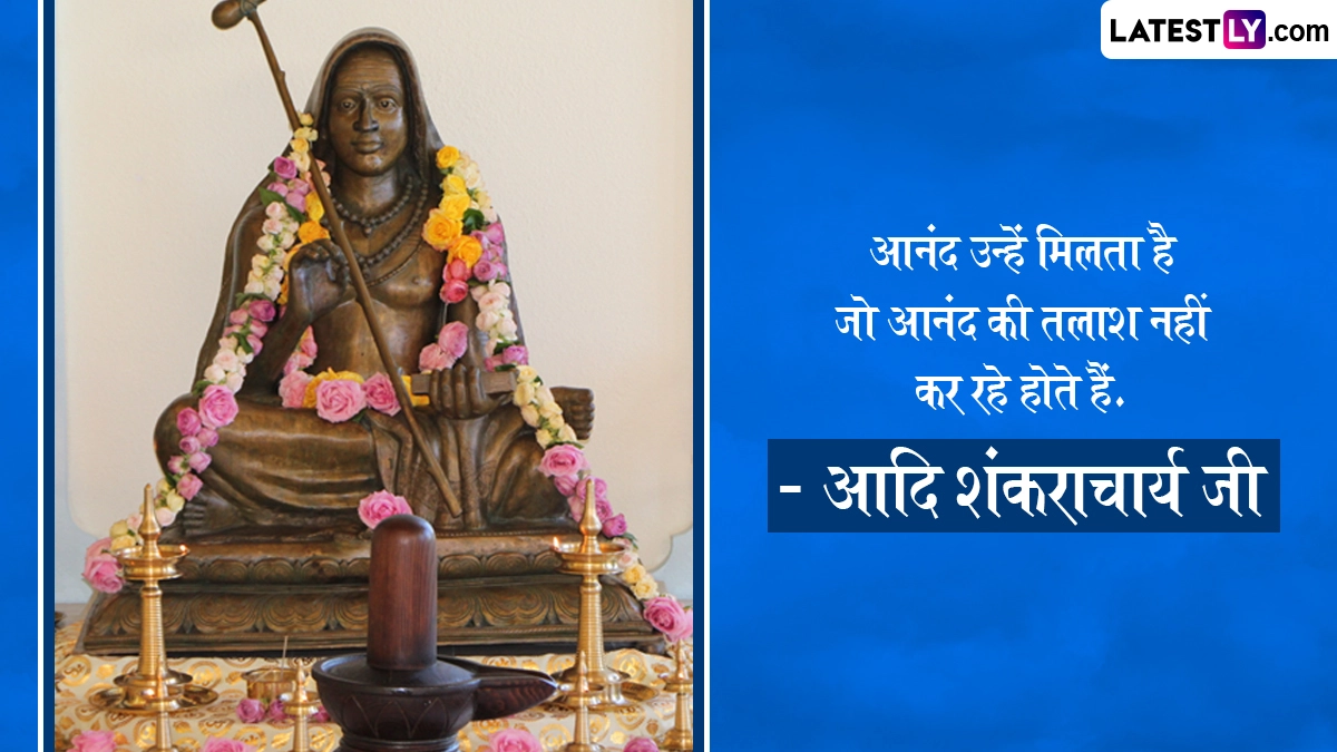 Adi Shankaracharya Jayanti 2025 Quotes: आदि शंकराचार्य का जन्म आर्यम्बा और शिवगुरु के घर हुआ था, जो कृष्ण यजुर्वेद की वैदिक शाखा से संबंधित नंबूद्री ब्राह्मण थे. शंकराचार्य का जन्मस्थान केरल में पूर्णा नदी के तट पर स्थित कलाडी था. कलाडी तिरु शिव पेरूर (वर्तमान त्रिचूर) से कुछ मील की दूरी पर स्थित है, जिसमें शिव टीला वृषभाल है, जहाँ शिवगुरु और आर्यम्बा ने प्रार्थना की थी और उन्हें दिव्य संतान की प्राप्ति हुई थी. 788 ई. में शंकराचार्य के जन्म की यह घटना जिसने वैदिक प्रणाली के पुनरुद्धार की शुरुआत को चिह्नित किया, का वर्णन माधवीय शंकर विजयम में इस प्रकार किया गया है. जिस प्रकार दिव्य माता पार्वती ने कार्तिकेय को जन्म दिया, उसी प्रकार पुण्यशाली आर्यम्बा ने शंकराचार्य को जन्म दिया, शुभ वैशाख शुक्ल पंचमी (अप्रैल-मई के दौरान बढ़ते चंद्रमा का पांचवा दिन) वर्ष 788 ई. हुआ. यह भी पढ़ें: Shankaracharya Jayanti 2025 Wishes: आदि शंकराचार्य जयंती पर इन WhatsApp Stickers, GIFs और HD Wallpapers को भेजकर दें बधाई