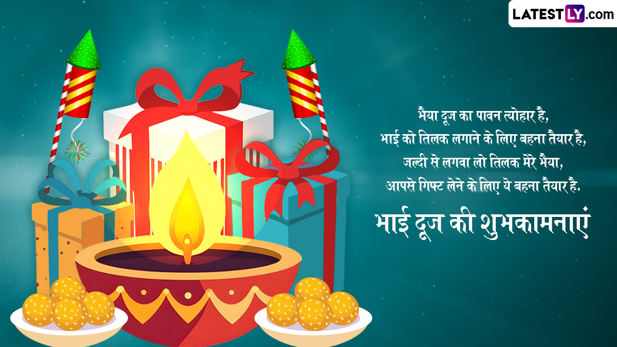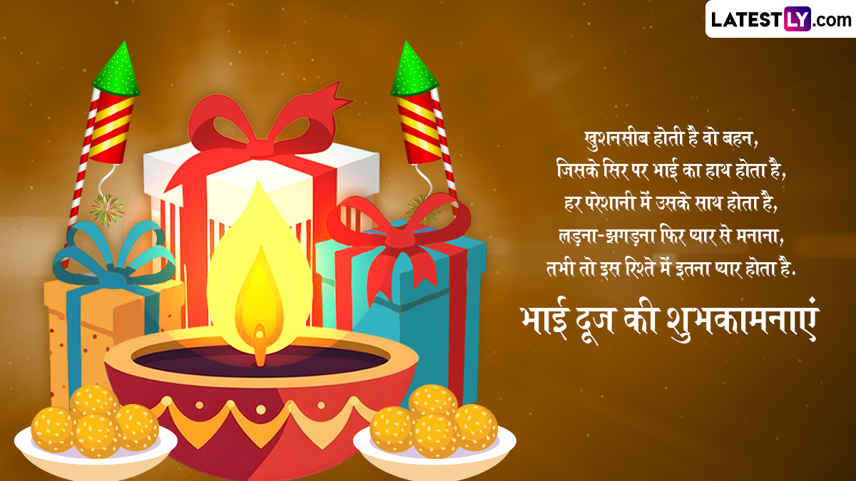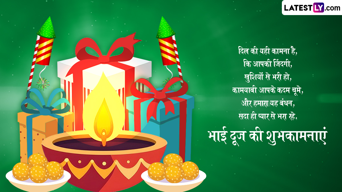 इस साल भाई दूज 23 अक्टूबर 2025 को पड़ रहा है, द्वितीया तिथि 22 अक्टूबर को रात 8:16 बजे शुरू होकर 23 अक्टूबर को रात 10:46 बजे समाप्त होगी. भाई दूज 2025 की इस तिथि और मुहूर्त का वास्तविक अर्थ यह है कि पारंपरिक बहन-भाई का तिलक दोपहर में किया जाना चाहिए, भले ही तिथि पिछले दिन की देर शाम से लेकर त्योहार वाले दिन की देर शाम तक हो. जो भाई बहन एक दूसरे से बहुत दूर हैं और एक दूसरे से मिल नहीं सकते वे नीचे दिए गए WhatsApp Status, HD Images और Wallpapers भेजकर शुभकामनाएं दे सकते हैं.