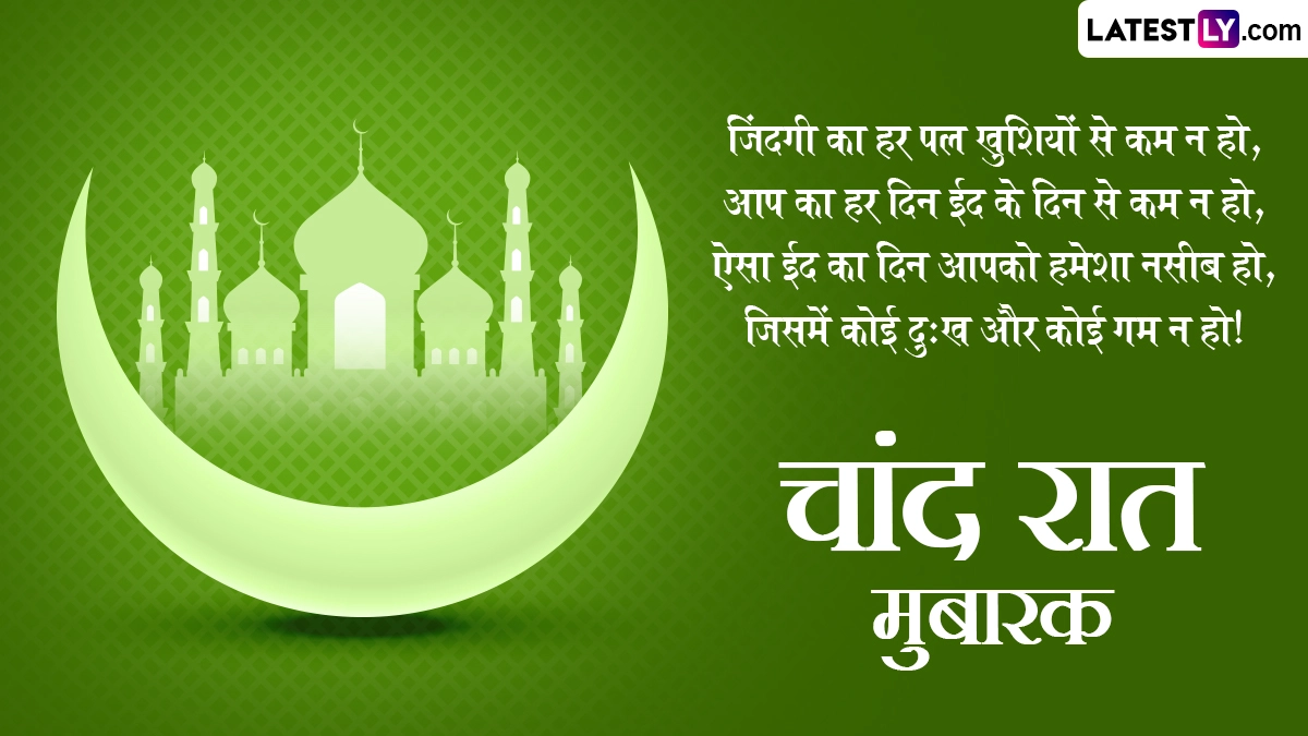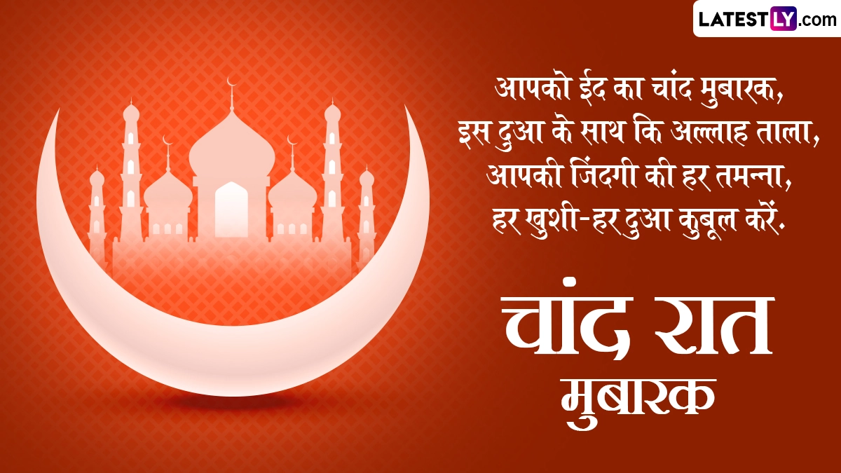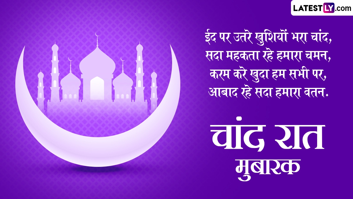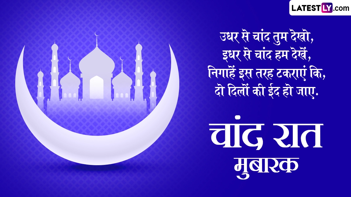 Chand Raat Mubarak 2024 Wishes in Hindi: दुनिया भर के मुसलमान रमजान (Ramzan) के पाक महीने में पूरे 29 या 30 दिन तक रोज रखकर अल्लाह की इबादत करते हैं. 29वें या 30वें रोजे के बाद जब शव्वाल (Shawwal) का चांद नजर आ जाता है तो उसके अगले दिन ईद का त्योहार मनाया जाता है, जिसे रमजान ईद (Ramzan Eid), ईद-अल-फितर (Eid al-Fitr), ईद-उल-फितर (Eid ul-Fitr), मीठी ईद (Meethi Eid) जैसे विभिन्न नामों से जाना जाता है. दुनिया भर के रोजेदारों को शव्वाल के चांद का बेसब्री से इंतजार रहता है, क्योंकि इस पाक रात को ईनाम की रात भी कहा जाता है. आपको बता दें कि जिस दिन शव्वाल का चांद नजर आता है, उसे चांद रात कहा जाता है और यह रमजान महीने के अंत व ईद-उल-फितर की पूर्व संध्या का प्रतीक होता है. इसे रमजान के रोजे के दौरान रोजेदारों के धैर्य, समर्पण के प्रतिफल के तौर पर देखा जाता है. चांद रात की शाम को दुनिया भर के मुसलमान खुले आसमान के नीचे चांद का दीदार करने के लिए इकट्ठा होते हैं और जब ईद का चांद दिखाई देता है तो एक-दूसरे को गले लगाकर चांद रात मुबाकर कहते हैं.