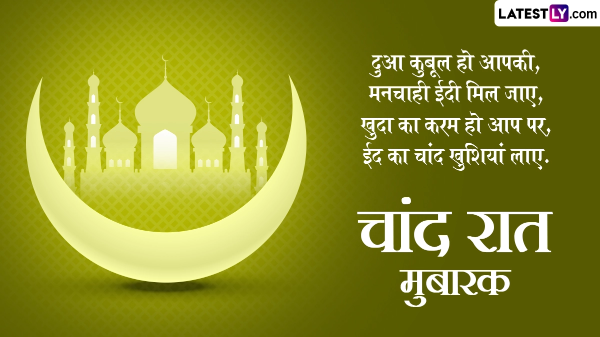 माह-ए-रमजान में करीब 29 या 30 रोजे की अवधि अमावस्या की रात को खत्म होती है और लोग चांद के निकलने का बेसब्री से इंतजार करते हैं. चांद के दीदार के बाद से ही मुबारकबाद देने का सिलसिला शुरु हो जाता है. ऐसे में चांद रात के इस खास अवसर पर आप अपने दोस्तों-रिश्तेदारों को इन शानदार हिंदी विशेज, कोट्स, वॉट्सऐप मैसेजेस, जीआईएफ ग्रीटिंग्स के जरिए चांद रात मुबारक कह सकते हैं.