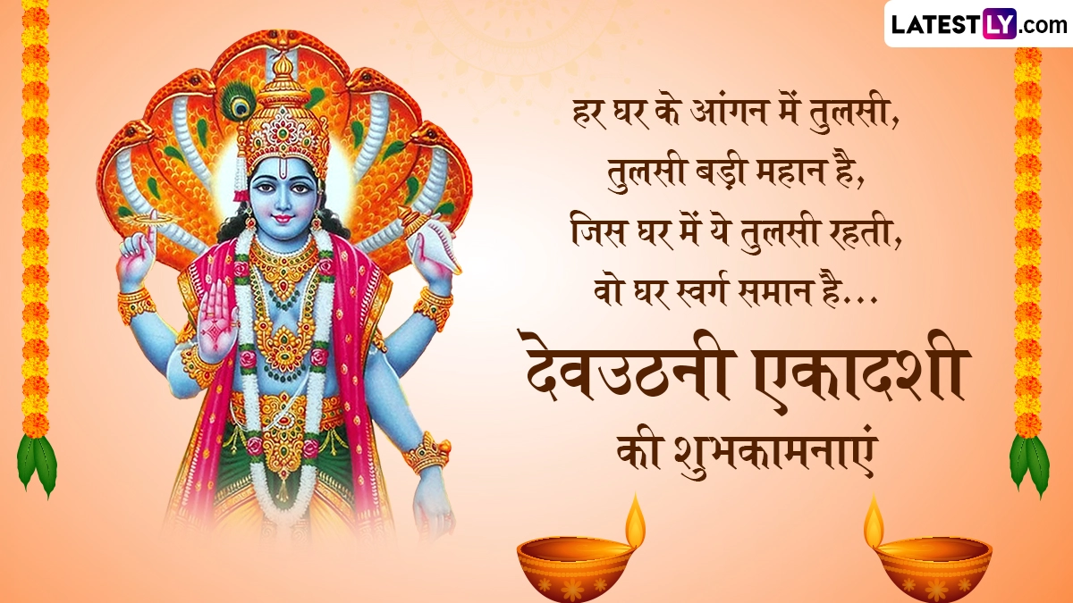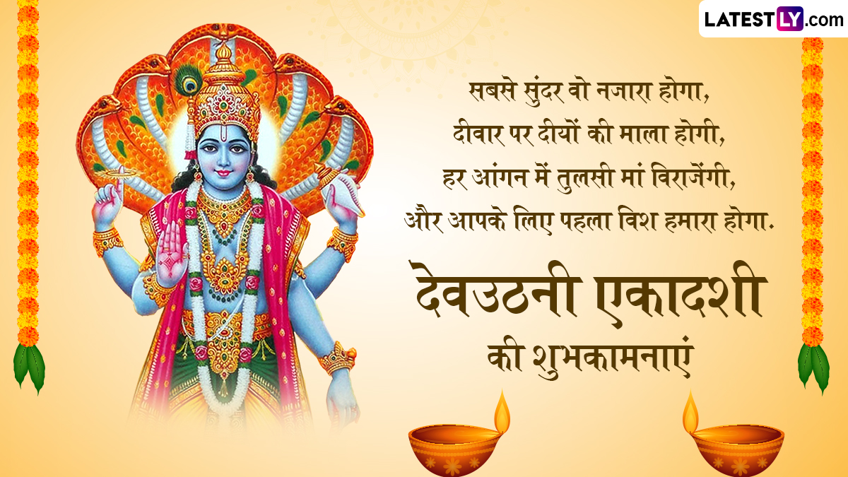 Dev Uthani Ekadashi 2025 Wishes in Hindi: चार महीने के चतुर्मास के बाद कार्तिक मास के शुक्ल पक्ष की एकादशी तिथि को जगत के पालनहार भगवान विष्णु (Bhagwan Vishnu) चार महीने की योग निद्रा से जागते हैं, इसलिए इस एकादशी को देवउठनी एकादशी (Dev Uthani Ekadashi) मनाई जाती है. हिंदू धर्म में इस एकादशी को अत्यंत पवित्र और शुभ माना जाता है. भगवान विष्णु के जागरण के साथ ही चतुर्मास का समापन होता है और विवाह, गृह प्रवेश, मुंडन जैसे सभी मांगलिक कार्य एक बार फिर से शुरु हो जाते हैं. देवउठनी एकादशी को देव प्रबोधिनी एकादशी, देवोत्थान एकादशी (Devutthana Ekadashi) और प्रबोधिनी एकादशी (Prabodhini Ekadashi) जैसे नामों से भी जाना जाता है. इस दिन भक्त विधि-विधान से भगवान विष्णु और माता लक्ष्मी की पूजा-अर्चना करते हैं. इस साल एकादशी तिथि दो दिन पड़ रही है. ऐसे में गृहस्थ लोग 1 नवंबर को और वैष्णव संप्रदाय के लोग 2 नवंबर 2025 को देवउठनी एकादशी का व्रत रख रहे हैं.