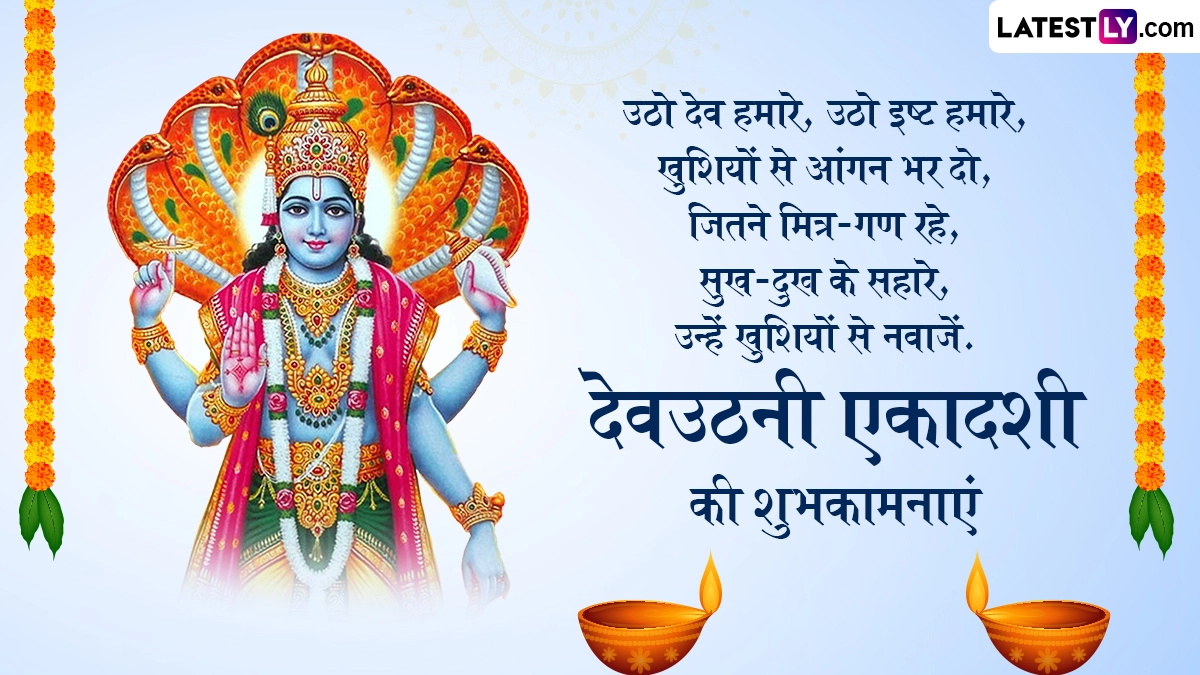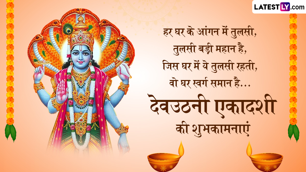 मान्यता है कि देवउठनी एकादशी के दिन सच्चे मन से उपासना करने से भक्तों को विष्णु जी का आशीर्वाद प्राप्त होता है और घर-परिवार में सुख-समृद्धि का भी वास रहता है. इसी दिन जगत के पालनहार भगवान विष्णु चार महीने की योगनिद्रा से जागते हैं और उनके योगनिद्रा से बाहर आते ही चतुर्मास का समापन हो जाता है. इस अवसर पर आप हिंदी विशेज, वॉट्सऐप मैसेजेस, कोट्स, फेसबुक ग्रीटींग्स के जरिए देवउठनी एकादशी की शुभकामनाएं दे सकते हैं.