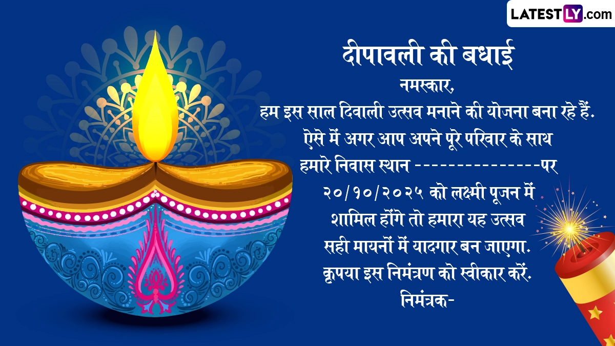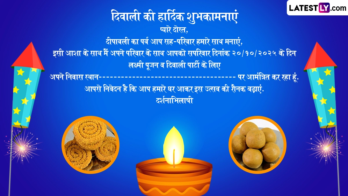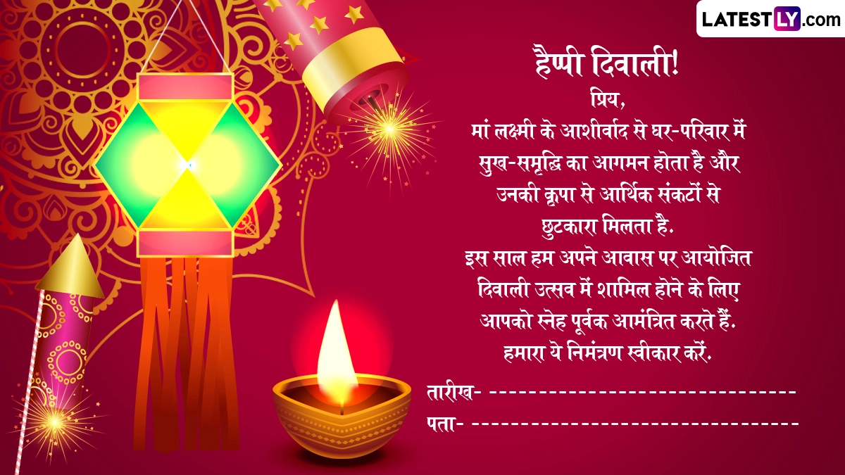 मैं आपको अपने निवास स्थान पर 20/10/2025 के दिन दीपावली उत्सव मनाने के लिए आमंत्रित कर रहा हूं, ताकि आपके परिवार के साथ मेरा पूरा परिवार इस पर्व को धूमधाम से मना सके. ढेर सारे प्यार और इस निमंत्रण पत्र के जरिए मैं आपको सह-परिवार इस उत्सव में शामिल होने के लिए न्योता भेज रहा हूं, इसे स्वीकार कर मेरा मान बढ़ाएं.