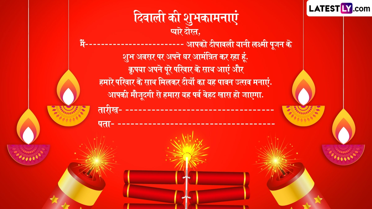 दिवाली सेलिब्रेशन के लिए लोग भव्य पूजा, दिवाली मिलन समारोह या दिवाली पार्टी का आयोजन करते हैं, जिसका जश्न वो अपने दोस्तों-रिश्तेदारों और करीबियों के साथ मनाते हैं. ऐसे में अगर आप भी इस साल दिवाली पार्टी का आयोजन कर रहे हैं और उसमें शामिल होने के लिए अपने दोस्तों-रिश्तेदारों को न्योता देना चाहते हैं तो ये प्यार भरे हिंदी ई-इनविटेशन कार्ड उनके साथ शेयर कर सकते हैं.