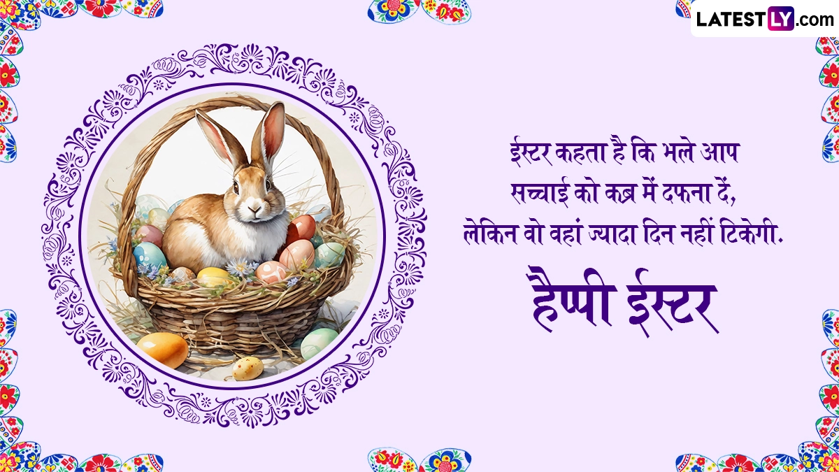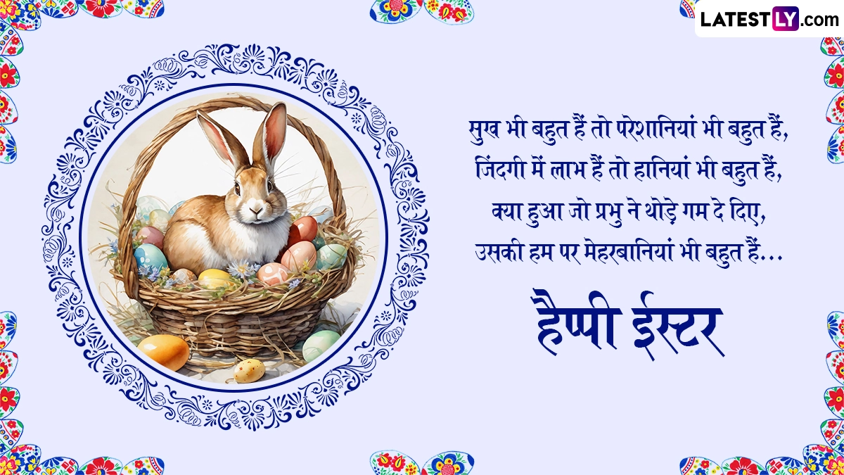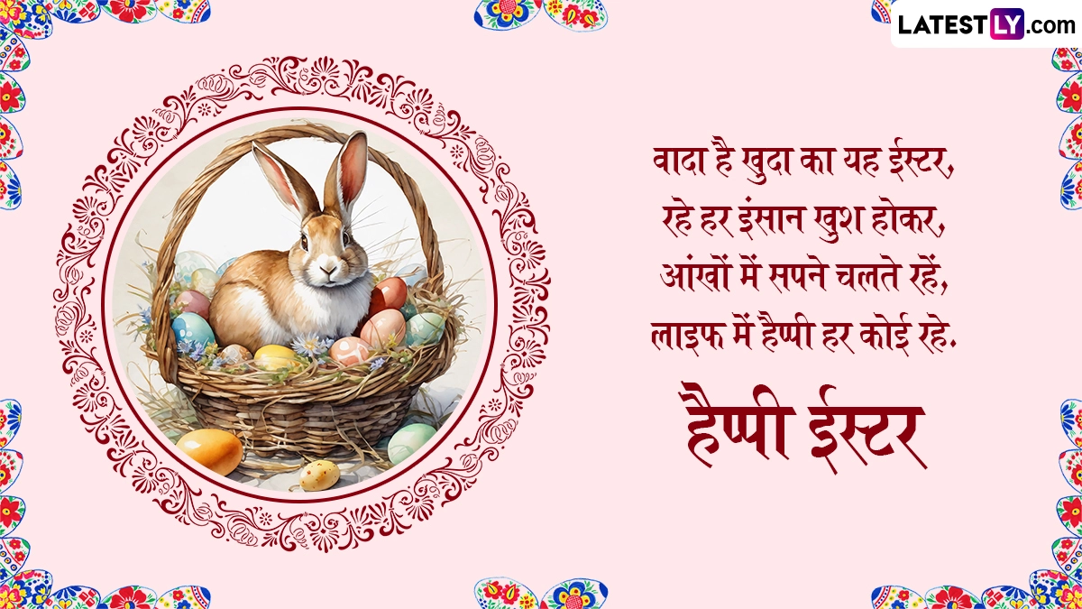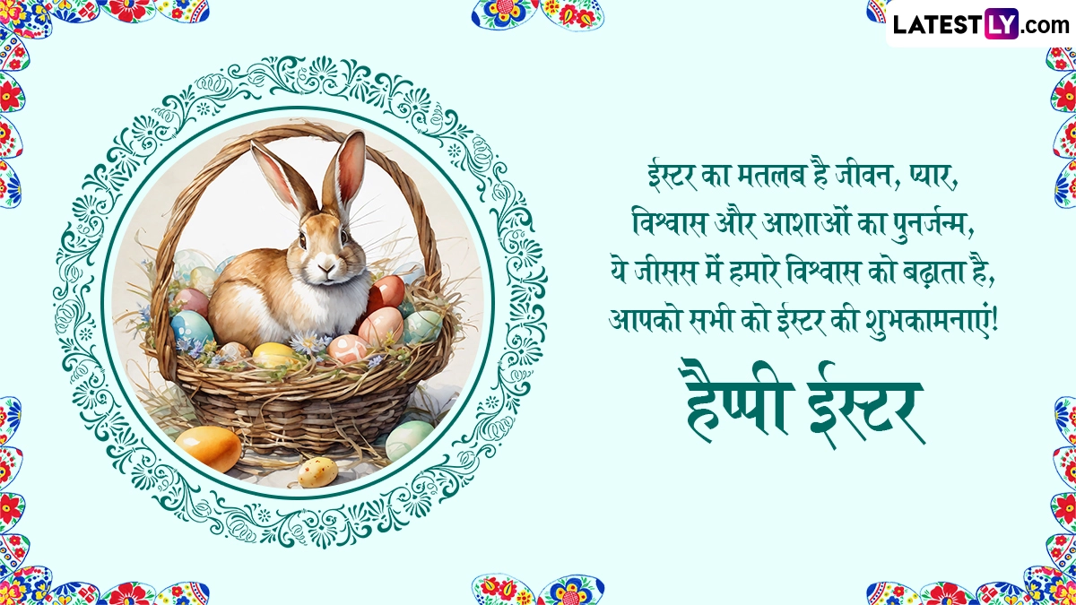 ईस्टर के पर्व को मनाने के लिए रंग-बिरंगी अंडों को सजाया जाता है, जो कि इस पर्व पर निभाई जाने वाली एक लोकप्रिय परंपरा है. इन अंडों को नए जीवन का प्रतीक माना जाता है. इस दिन लोग चर्च में विशेष प्रार्थनाएं करते हैं और एक-दूसरे को शुभकामना संदेश भी भेजते हैं. ऐसे में आप भी इन हिंदी मैसेजेस, शायरी, वॉट्सऐप विशेज, जीआईएफ ग्रीटिंग्स और फोटो एसएमएस के जरिए अपने प्रियजनों से हैप्पी ईस्टर कह सकते हैं.