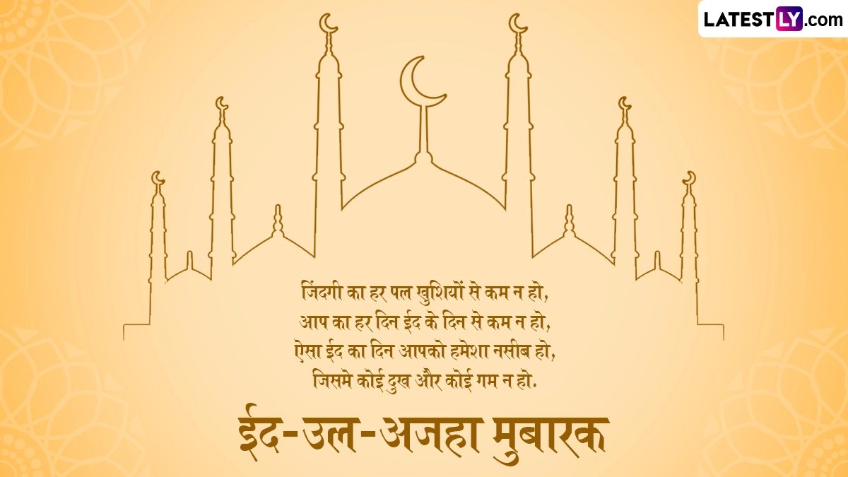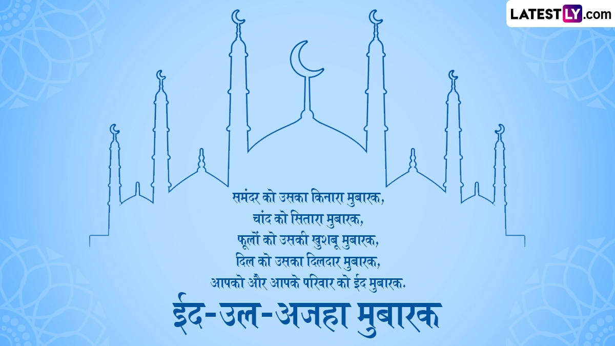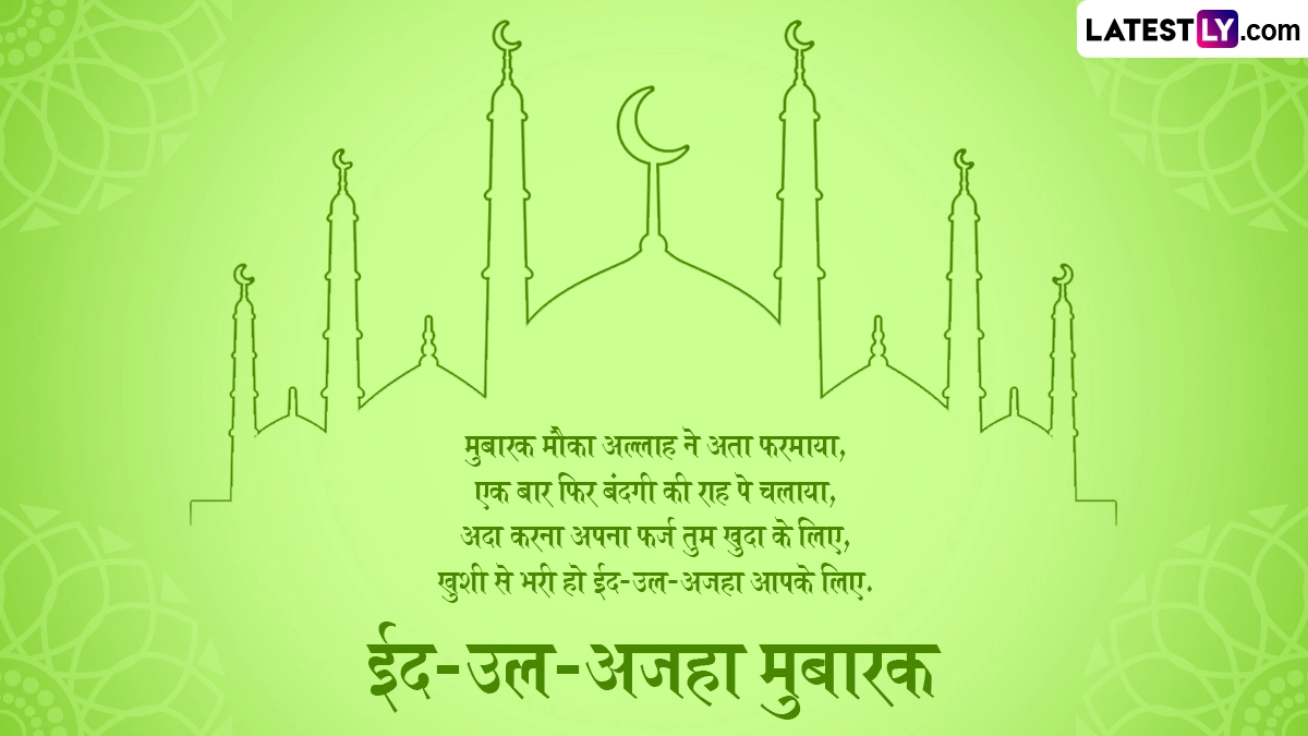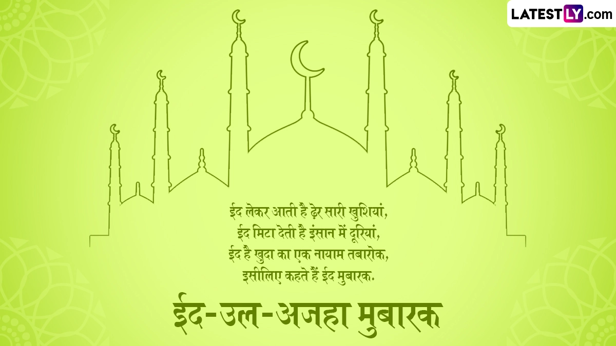 बकरीद यानी ईद-उल-अजहा के दिन सुबह के समय लोग ईदगाह और मस्जिदों में नमाज अदा करने के लिए इकट्ठा होते हैं, इसके बाद वो एक-दूसरे से गले मिलकर बकरीद मुबारक कहते हैं. ऐसे में इस बेहद खास अवसर पर आप भी ईद-उल-अजहा के इन शानदार हिंदी विशेज, कोट्स, वॉट्सऐप मैसेजेस, फेसबुक ग्रीटिंग्स को अपने प्रियजनों के साथ शेयर करके उन्हें मुबारकबाद दे सकते हैं.