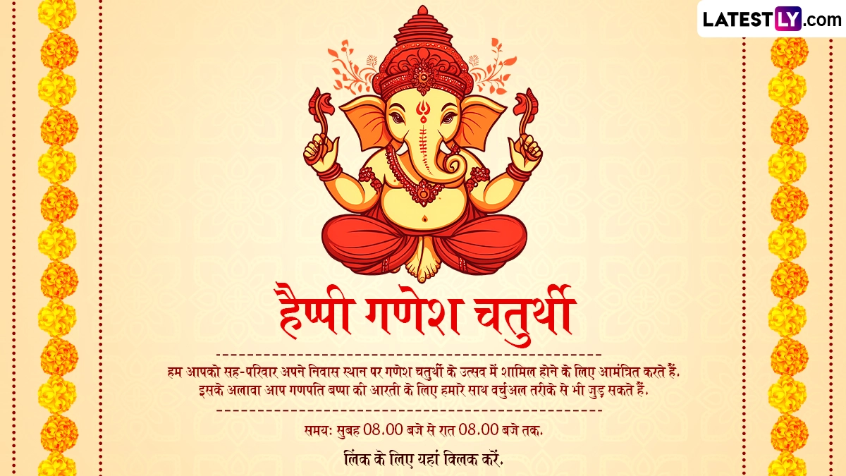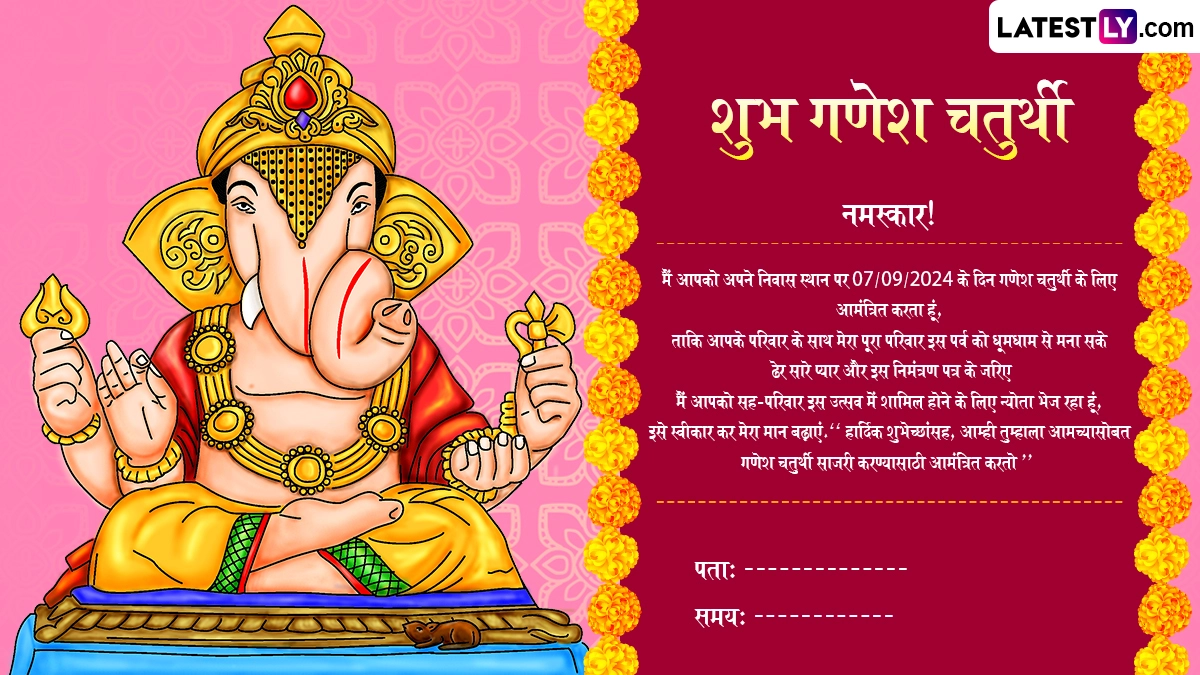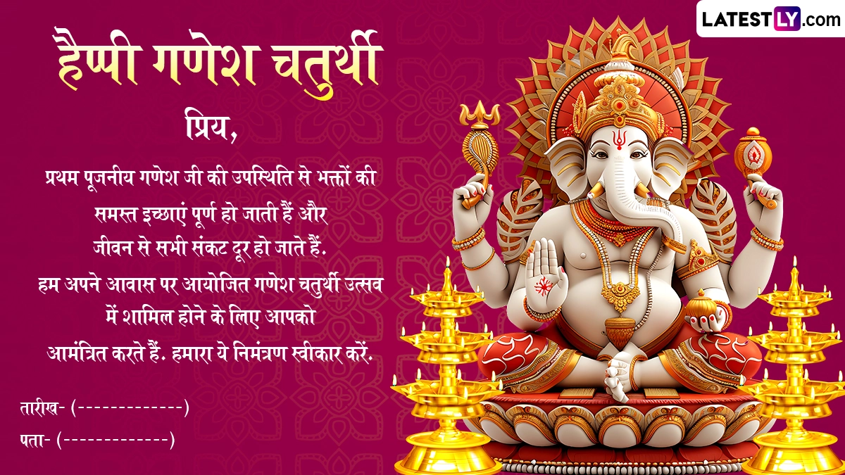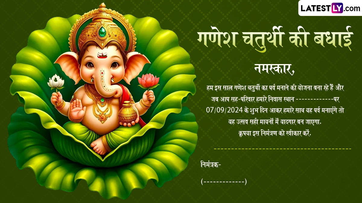 Ganesh Chaturthi 2024 Invitation Card: गणेश चतुर्थी (Ganesh Chaturthi), जिसे विनायक चतुर्थी (Vinayaka Chavithi) या विनायक चविथी (Vinayaka Chavithi) के नाम से भी जाना जाता है, एक व्यापक रूप से मनाया जाने वाला हिंदू त्यौहार है. यह त्यौहार दुनिया भर में हिंदू समुदाय द्वारा मनाया जाता है. यह विशेष रूप से महाराष्ट्र राज्य में बड़े पैमाने पर मनाया जाता है. गणेश चतुर्थी भगवान गणेश की जयंती का प्रतीक है, जिन्हें बुद्धि, ज्ञान और नई शुरुआत का देवता माना जाता है. 10 दिवसीय गणेशोत्सव उत्सव अपार आनंद, उत्साह, सांस्कृतिक कार्यक्रमों, जीवंतता, संगीत, गीतों और भजनों के साथ मनाया जाता है. भक्तों द्वारा निभाई जाने वाली एक प्रमुख परंपरा भगवान गणेश की मूर्ति को घर लाना है. फिर दोस्तों और परिवार को दर्शन के लिए आमंत्रित किया जाता है. यदि आप गणेश चतुर्थी 2024 निमंत्रण कार्ड, गणपति दर्शन निमंत्रण कार्ड टेम्प्लेट, या गणेश चतुर्थी 2024 इन्विटेशन कार्ड की तलाश कर रहे हैं, तो आप सही जगह पर आए हैं!