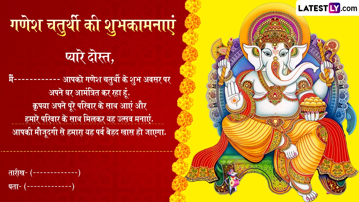 मैं------------ आपको गणेश चतुर्थी के शुभ अवसर पर अपने घर आमंत्रित कर रहा हूं. कृपया अपने पूरे परिवार के साथ आएं और हमारे परिवार के साथ मिलकर यह उत्सव मनाएं. आपकी मौजूदगी से हमारा यह पर्व बेहद खास हो जाएगा.