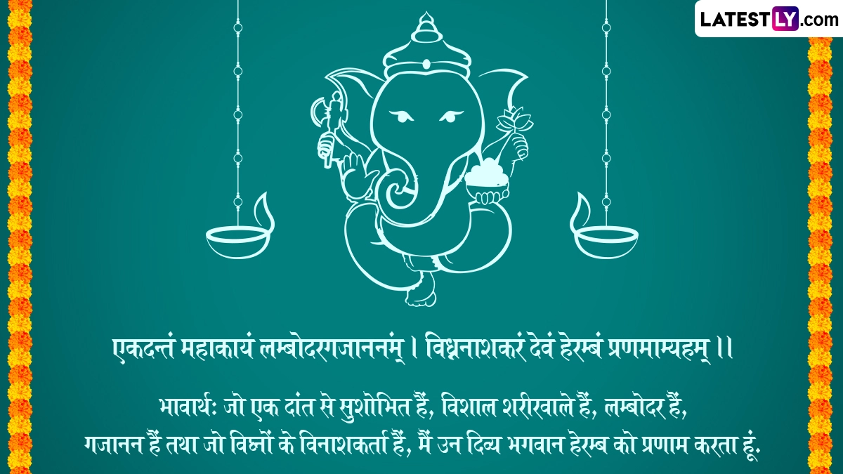 भावार्थ: जो एक दांत से सुशोभित हैं, विशाल शरीरवाले हैं, लम्बोदर हैं, गजानन हैं तथा जो विघ्नों के विनाशकर्ता हैं, मैं उन दिव्य भगवान हेरम्ब को प्रणाम करता हूं.