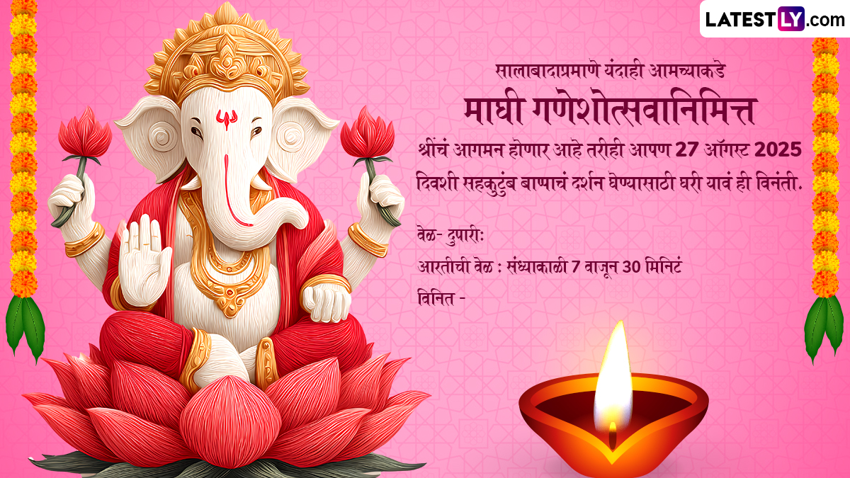 Ganesh Chaturthi 2025 Invitation Card in Marathi: गणेश चतुर्थी (Ganesh Chaturthi), जिसे विनायक चतुर्थी (Vinayaka Chaturthi) के नाम से भी जाना जाता है, भगवान गणेश के जन्मदिन के उपलक्ष्य में मनाया जाने वाला एक आनंदमय और भव्य हिंदू पर्व है. भगवान गणेश को विघ्नहर्ता, बुद्धि, समृद्धि और नई शुरुआतों के देवता माना जाता है. इस पावन अवसर पर श्रद्धालु भगवान गणेश की मूर्तियों को अपने घरों या सार्वजनिक पंडालों में स्थापित करते हैं. वे विधिपूर्वक पूजा-अर्चना, आरती और प्रसाद अर्पण करते हैं, विशेषकर मोदक, जो भगवान गणेश की प्रिय मिठाई मानी जाती है. यह उत्सव आमतौर पर 10 दिनों तक चलता है और अनंत चतुर्दशी के दिन, गणेश प्रतिमा के विसर्जन के साथ संपन्न होता है. भक्तगण भक्ति-भाव और संगीत-नृत्य के साथ सार्वजनिक जुलूस निकालते हैं और प्रतिमा को नदी, झील या समुद्र में विसर्जित कर विदाई देते हैं, यह कामना करते हुए कि भगवान गणेश अगले वर्ष फिर लौटें और सभी विघ्नों का नाश करें.