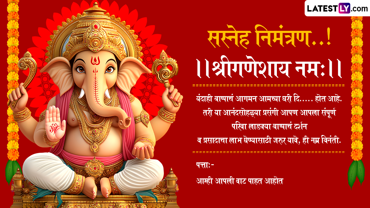 Ganesh Chaturthi 2025 Invitation Card: गणेश चतुर्थी (Ganesh Chaturthi) एक दस दिवसीय उत्सव है जो हिंदू कैलेंडर के अनुसार भाद्रपद माह की शुक्ल पक्ष की चतुर्थी से शुरू होता है. अंग्रेजी कैलेंडर के अनुसार, यह त्योहार आमतौर 27 अगस्त से शुरू होगा और 6 अगस्त अनंत चतुर्दशी तक मनाया जाएगा. गणेश चतुर्थी उत्सव भाद्रपद शुक्ल पक्ष की चतुर्थी तिथि से शुरू होगा और अनंत चतुर्दशी को समाप्त होता है. महाराष्ट्र में गणेश चतुर्थी का उत्सव भव्य रूप से मनाया जाता है. हर जगह सार्वजानिक गणेश पंडाल लगाए जाते हैं. रोजाना आरती और पूजा की जाती है. लगातार दस दिनों तक भगवान गणेश की पूजा करने के बाद, गणेश प्रतिमाएं धूमधाम से जल में इस विश्वास के साथ प्रवाहित की जाती हैं कि भगवान अगले वर्ष शीघ्र ही लौटेंगे. गणेश चतुर्थी पर महाराष्ट्र में 10 दिन तक मेले जैसा माहौल होता है. चारों ओर जग-मगाती हुई रोशनी दिखिया देती है. यह भी पढ़ें: Ganesh Chaturthi 2025: भारत के 5 सुप्रसिद्ध गणेश मंदिर, जो चमत्कारी ही नहीं, बल्कि यहां भक्तों की मन्नतें भी पूरी होती है!