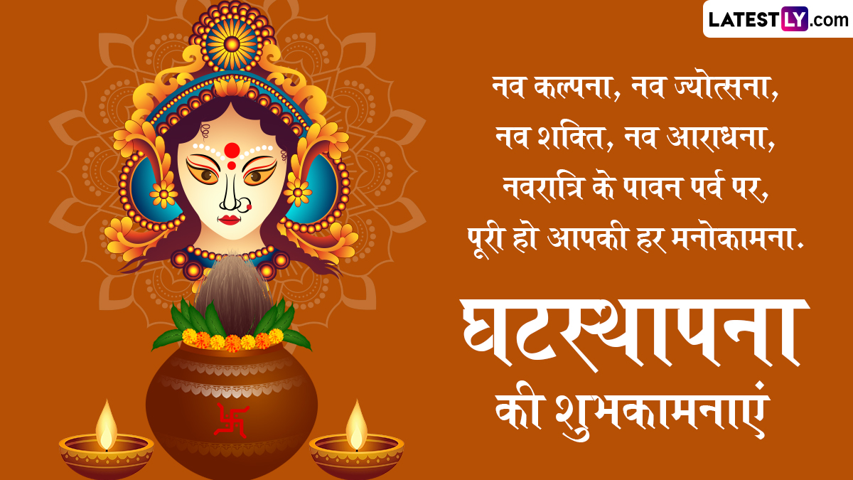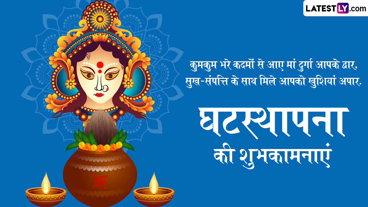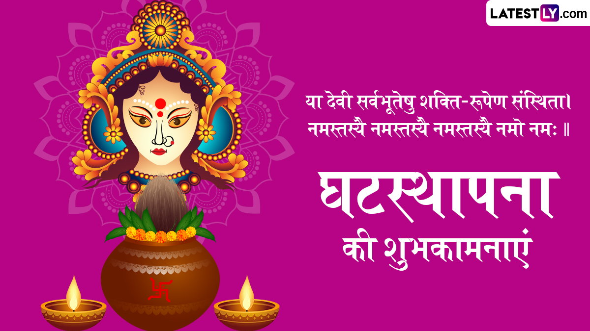 ऐसी मान्यता है कि मां दुर्गा का महालया के दिन कैलाश पर्वत से पृथ्वी पर आगमन होता है. ऐसे में नवरात्रि के पहले दिन घटस्थापना यानी कलश स्थापना कर देवी दुर्गा का आह्वान किया जाता है, फिर पूरे नौ दिनों तक मां दुर्गा के नौ स्वरूपों की उपासना की जाती है, साथ ही शुभकामना संदेशों का आदान-प्रदान किया जाता है. ऐसे में इस खास अवसर पर आप इन हिंदी विशेज, कोट्स, जीआईएफ ग्रीटिंग्स, वॉट्सऐप मैसेजेस के जरिए घटस्थापना की शुभकामनाएं दे सकते हैं.