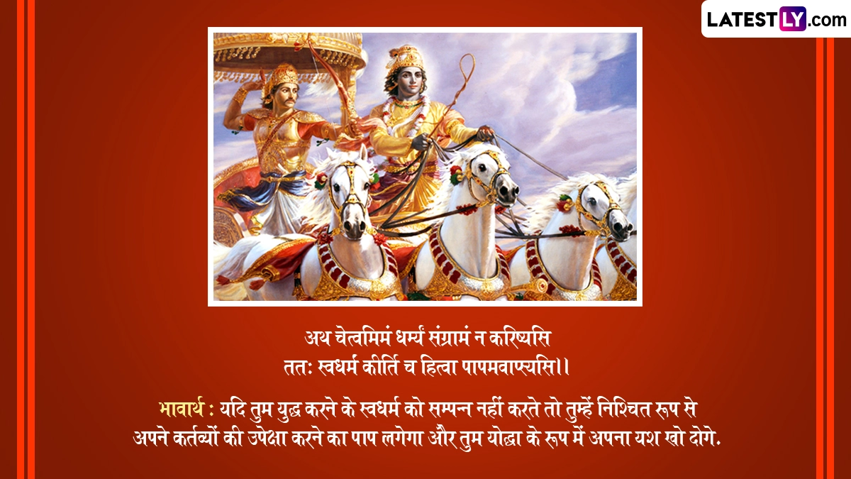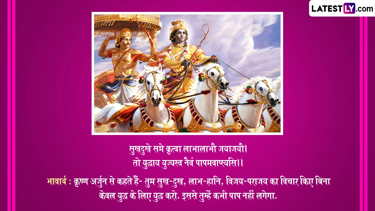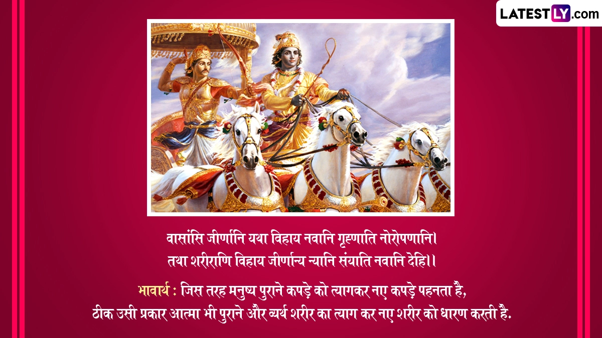 प्रचलित मान्यताओं के अनुसार, द्वापर युग में महाभारत के युद्ध से ठीक पहले कुरुक्षेत्र में श्रीकृष्ण ने मार्गशीर्ष शुक्ल एकादशी को अपने मुख से अर्जुन को गीता का उपदेश दिया था, इसलिए ऐसा माना जाता है कि इसी दिन श्रीमद्भगवत गीता का जन्म हुआ. ऐसे में इस अवसर पर आप इन शानदार श्लोक, विशेज, कोट्स, वॉट्सऐप मैसेजेस, फेसबुक ग्रीटिंग्स को शेयर करके अपनों को संस्कृत में गीता जयंती की शुभकामनाएं दे सकते हैं.