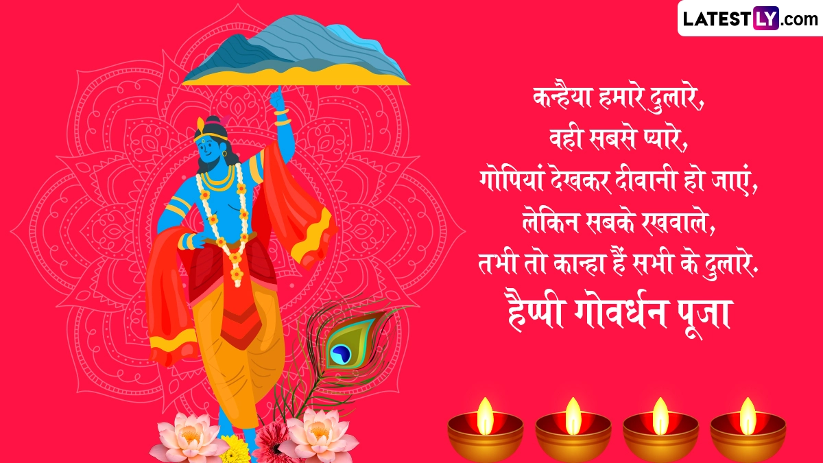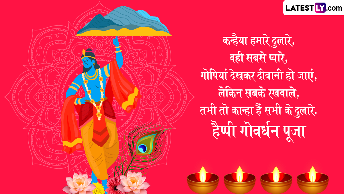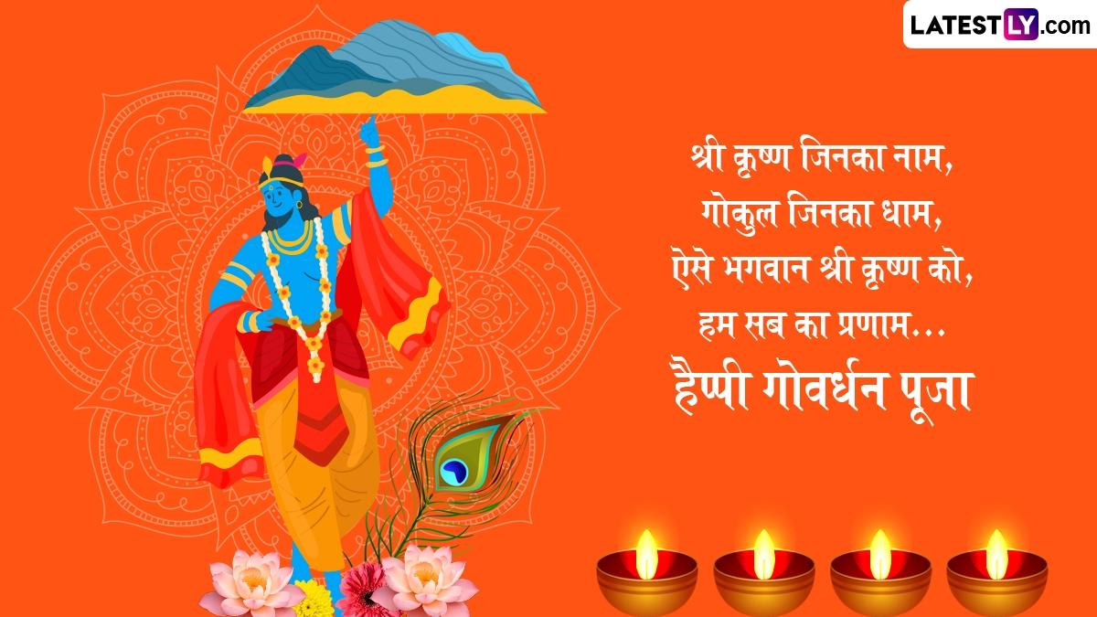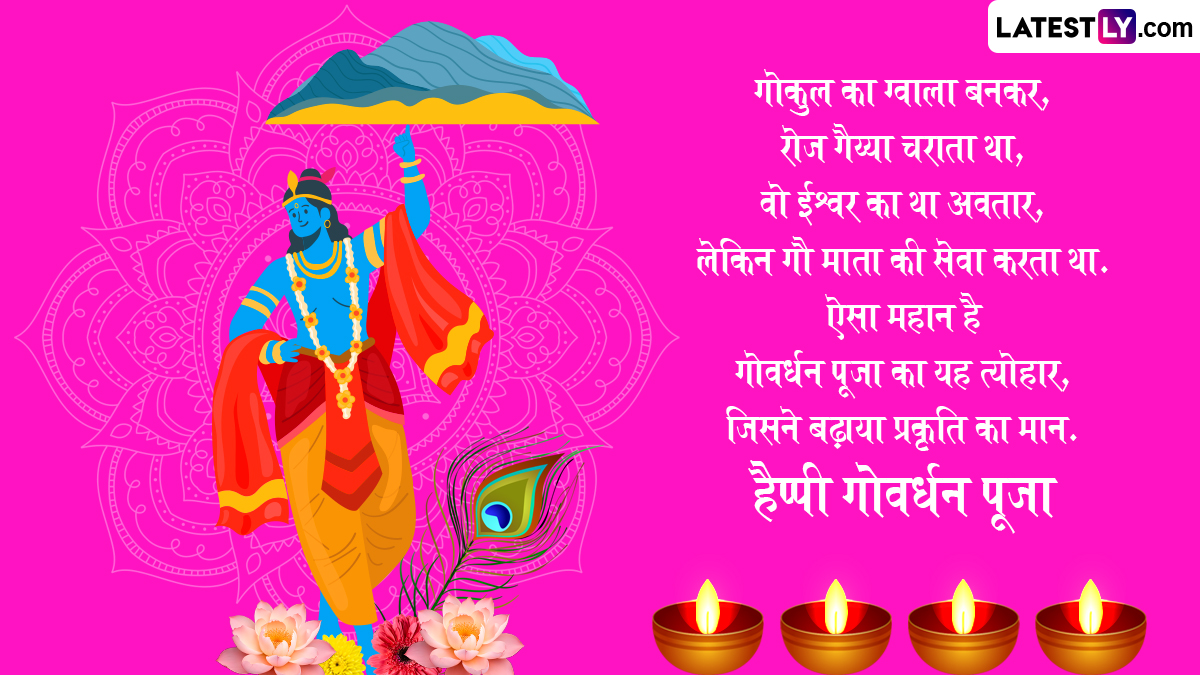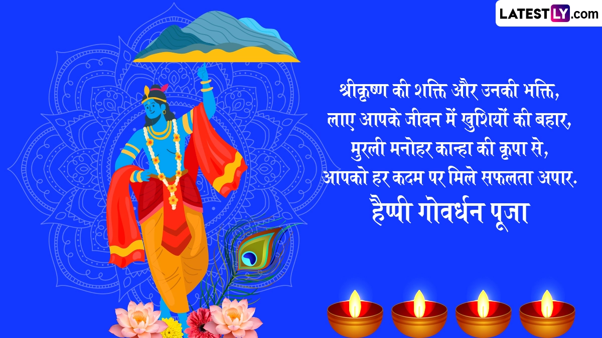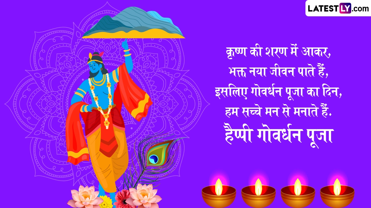 गोवर्धन पूजा के दिन गाय के गोबर से घर-आंगन में गोवर्धन पर्वत बनाया जाता है, फिर विधि-विधान से उसकी पूजा की जाती है और 56 प्रकार के व्यंजनों को भोग अर्पित किया जाता है, साथ ही पर्व की शुभकामनाएं दी जाती हैं. ऐसे में आप भी इन हिंदी मैसेजेस, वॉट्सऐप विशेज, जीआईएफ ग्रीटिंग्स और कोट्स के जरिए प्रियजनों से हैप्पी गोवर्धन पूजा कह सकते हैं.