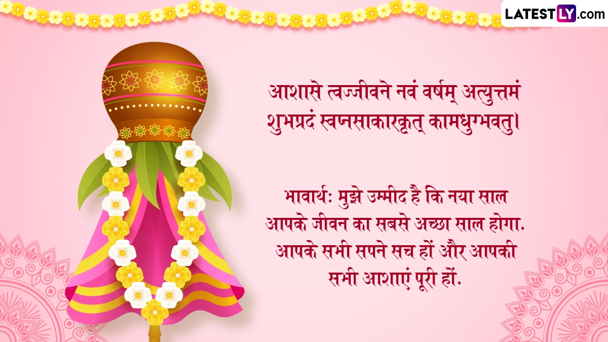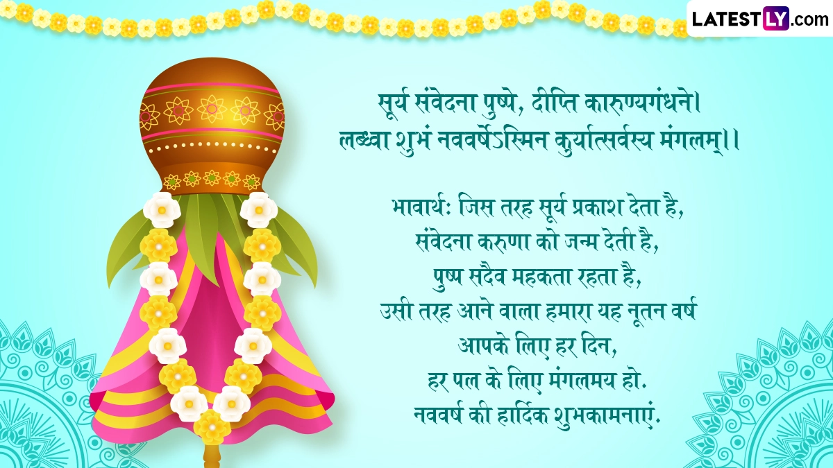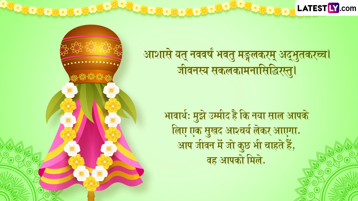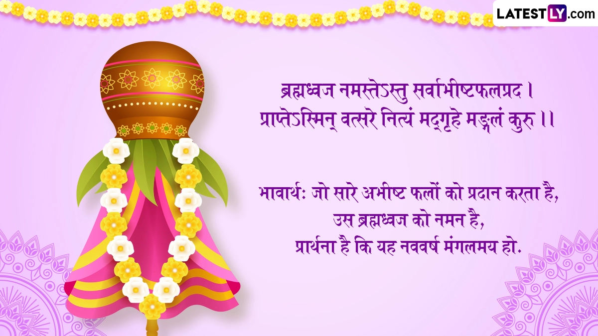 Gudi Padwa 2024 Wishes In Sanskrit: हिंदू धर्म में चैत्र मास (Chaitra Maas) का विशेष महत्व बताया जाता है, क्योंकि चैत्र शुक्ल प्रतिपदा से जहां मां दुर्गा (Maa Durga) की उपासना के नौ दिवसीय पावन पर्व चैत्र नवरात्रि (Chaitra Navratri) की शुरुआत होती है तो वहीं इस दिन हिंदू नव वर्ष (Hindu New Year) का आरंभ भी होता है. हिंदू नव वर्ष को देश के विभिन्न हिस्सों में अलग-अलग नामों से मनाया जाता है, जबकि महाराष्ट्र, आंध्र प्रदेश, तेलंगाना और कर्नाटक में इसे गुड़ी पड़वा (Gudi Padwa) के नाम से जाना जाता है. इस साल गुड़ी पड़वा का पर्व 9 अप्रैल 2024 को मनाया जा रहा है. गुड़ी का अर्थ विजय पताका होता है, इसलिए इस दिन लोग अपने घर के द्वार या खिड़की की ऊंचाई पर गुड़ी सजाते हैं और विधि-विधान से पूजा करते हैं. इस पावन अवसर पर लोग नए कपड़े पहनते हैं, घर के मुख्य द्वार पर रंगोली बनाई जाती है और घरों में स्वादिष्ट पकवान बनाए जाते हैं. कहा जाता है कि ऐसा करने से घर-परिवार में सुख-समृद्धि का आगमन होता है.