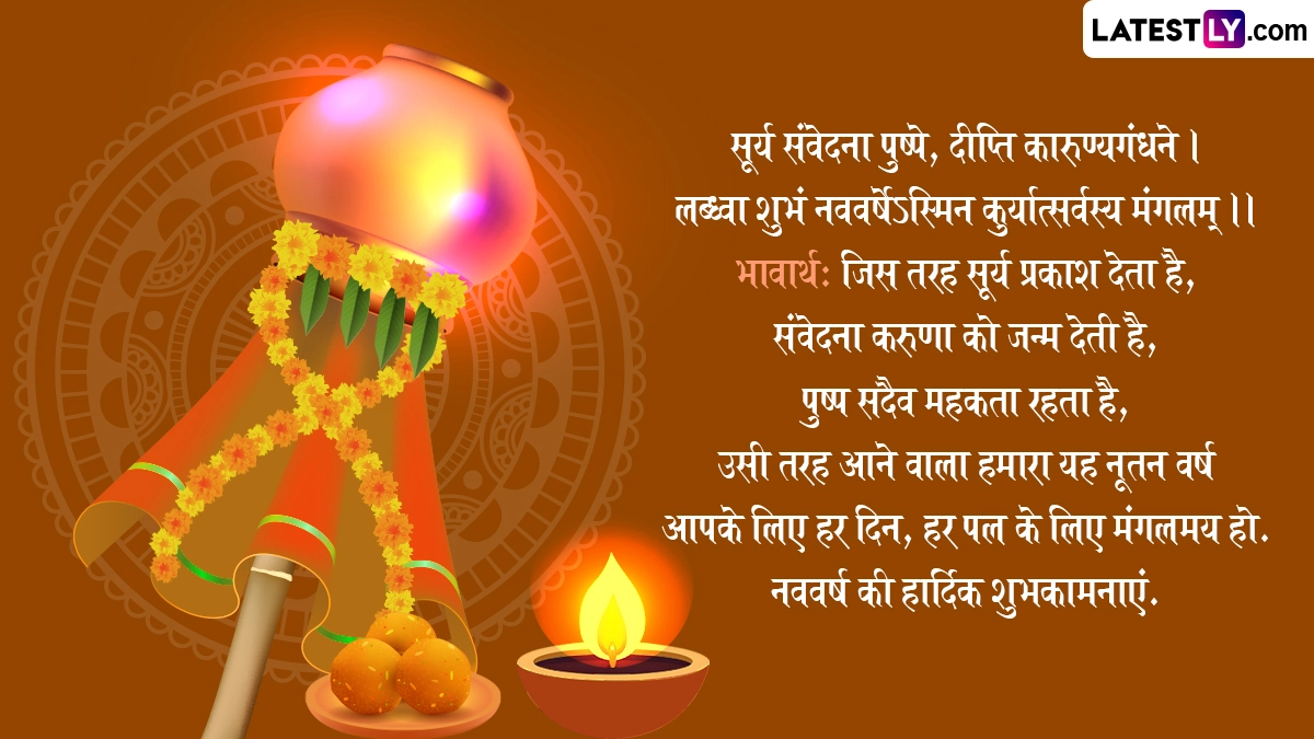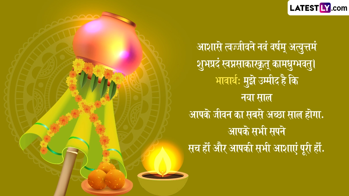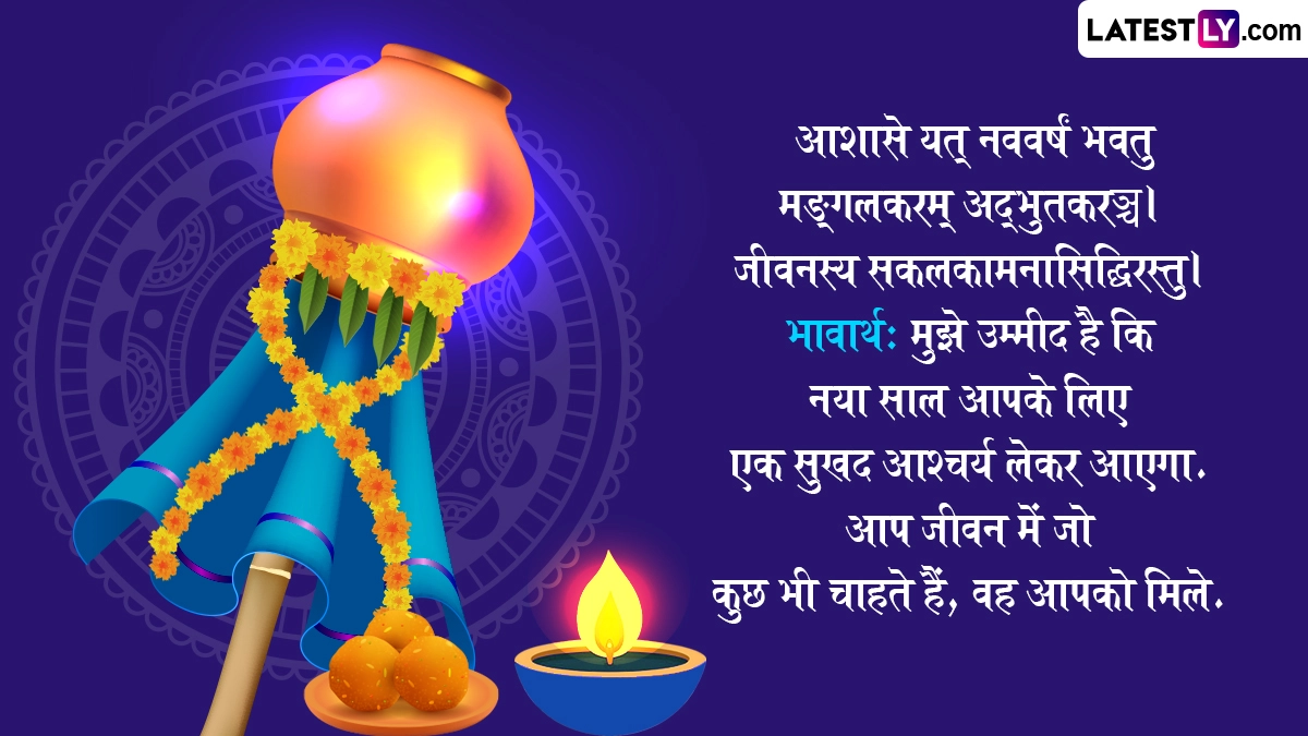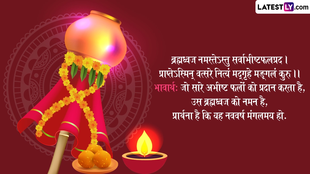 हिंदू नववर्ष को महाराष्ट्र में गुड़ी पड़वा के तौर पर सेलिब्रेट किया जाता है. ऐसे में इस डिजिटल युग में अपनी परंपराओं से जुड़े रहने के लिए आप इन संस्कृत श्लोकों और शुभकामना संदेशों को साझा कर सकते हैं. आप इन संस्कृत विशेज, श्लोक, वॉट्सऐप मैसेजेस, जीआईएफ ग्रीटिंग्स के जरिए अपनें प्रियजनों को शुभं भवतु नववर्षम् कहकर गुड़ी पड़वा की बधाई दे सकते हैं.