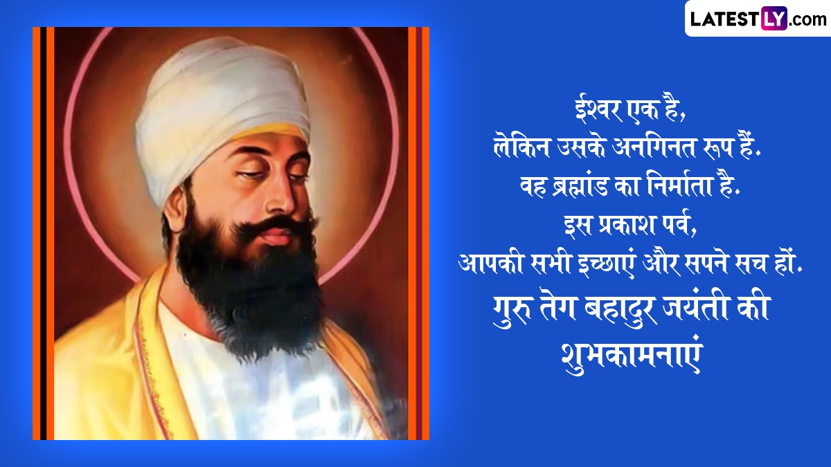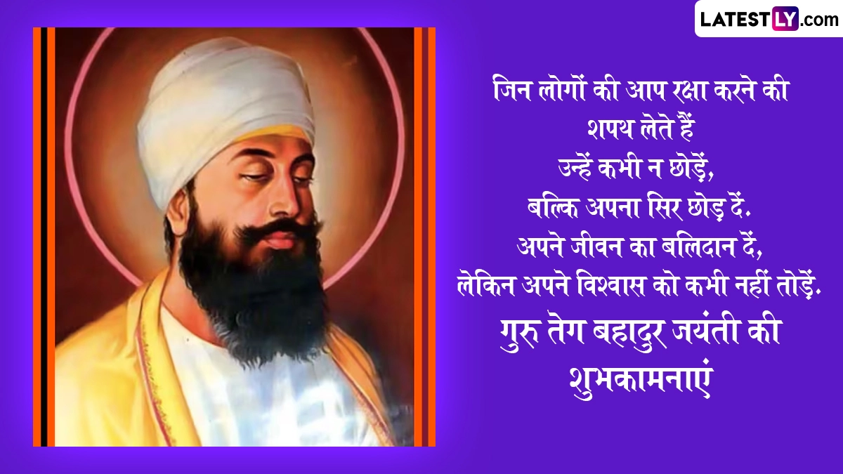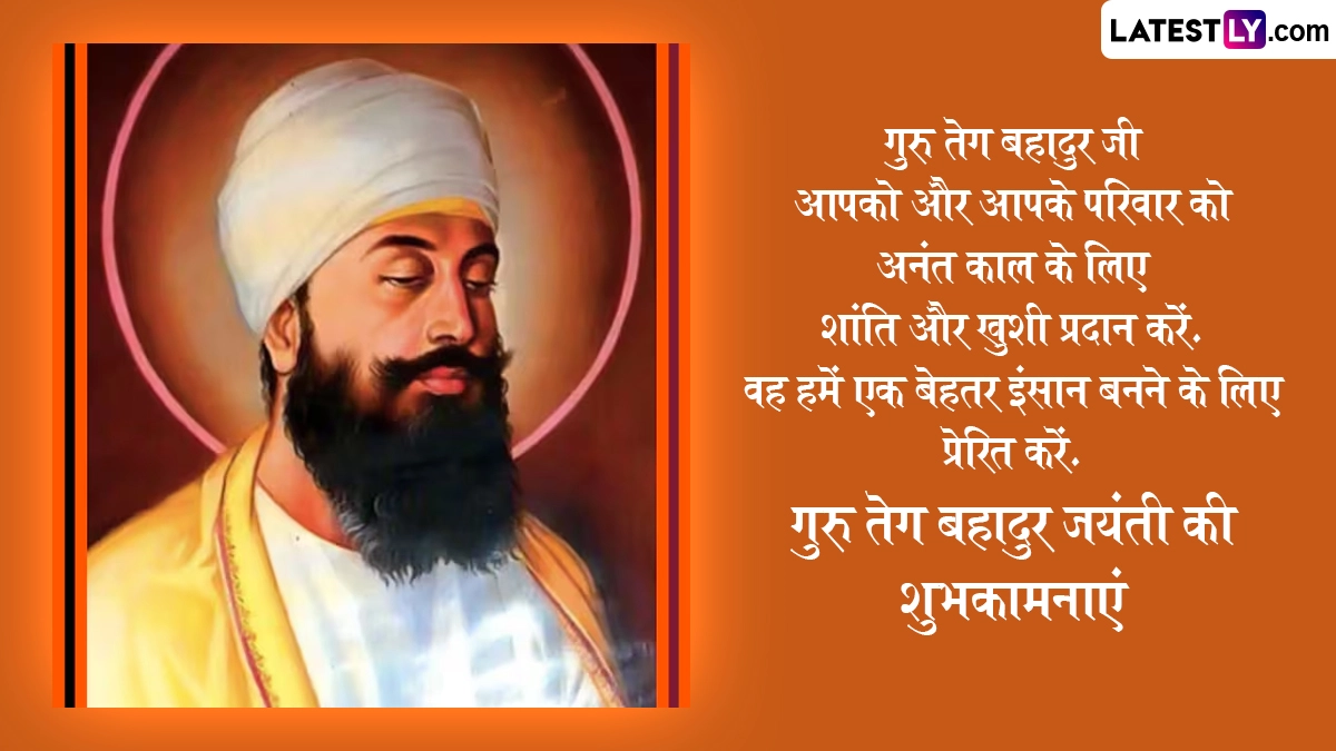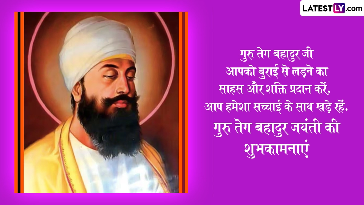 बचपन में त्यागमल कहे जाने वाले गुरु तेग बहादुर जी ने 14 वर्ष की उम्र में ही अपने पिता के साथ मुगलों के हमले के खिलाफ हुए युद्ध में वीरता का परिचय दिया था और उनकी इस वीरता से प्रभावित होकर उनके पिता ने ही उनका नाम ‘तेग बहादुर’ रखा था. गुरु तेग बहादुर जयंती के इस खास अवसर पर आप इन हिंदी विशेज, वॉट्सऐप मैसेजेस, कोट्स, जीआईएफ ग्रीटिंग्स के जरिए अपनों को प्रकाश पर्व की शुभकामनाएं दे सकते हैं. यह भी पढ़ें: Guru Tegh Bahadur Jayanti 2025: सिखों के नौवें गुरु, गुरु तेग बहादुर जी के प्रकाश पर्व पर इन Wishes, Greetings, Messages के जरिए दें अपनों को शुभकामनाएं