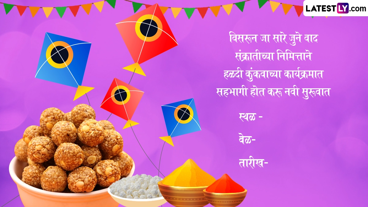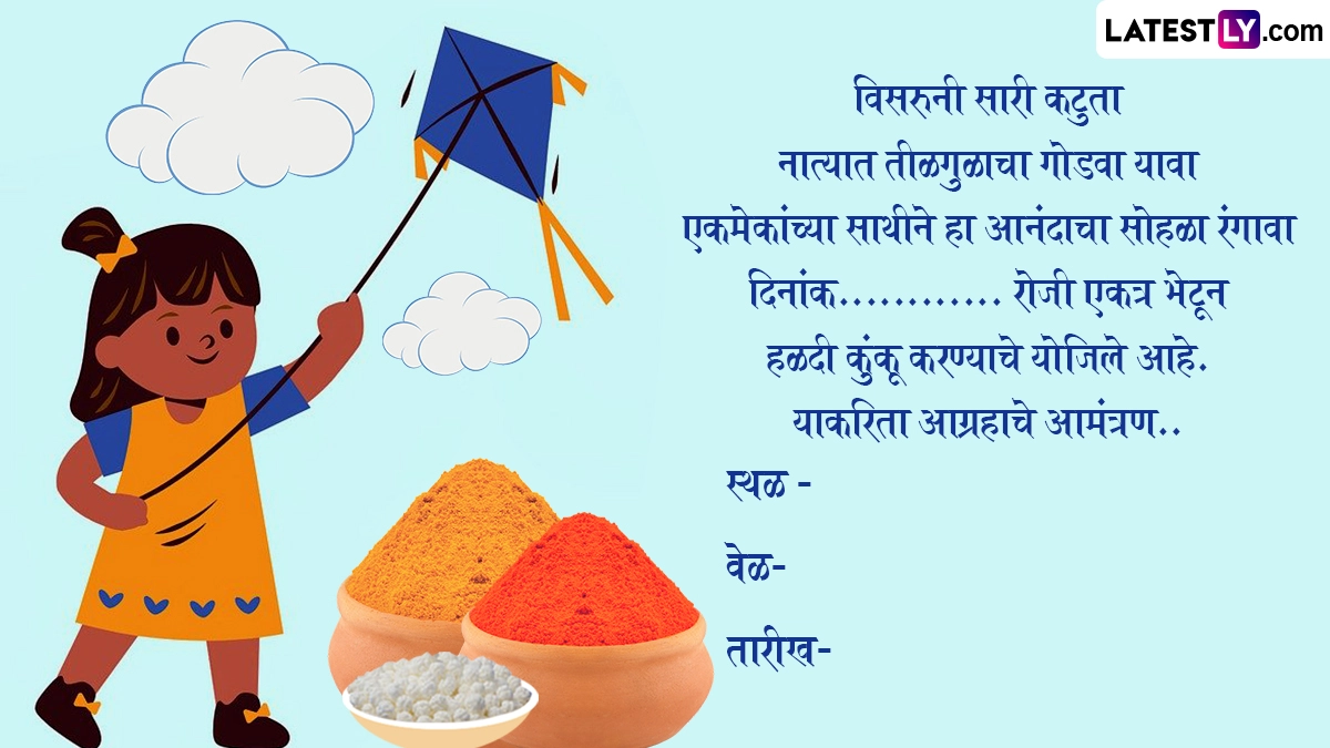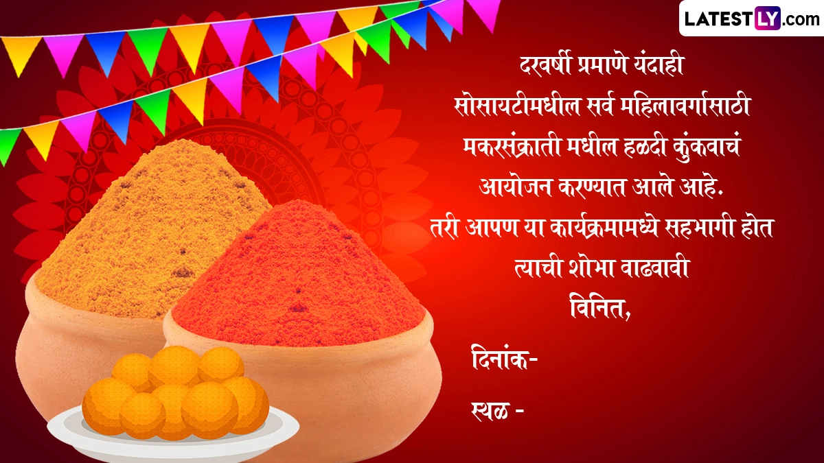 Haldi Kunku Invitation Format in Marathi: मकर संक्रांति (Makar Sankranti 2025) का त्यौहार 14 जनवरी को मनाया जा रहा है. मकर संक्रांति का त्यौहार देश भर में अलग-अलग नामों से मनाया जाता है. यह त्योहार विवाहित महिलाओं के लिए बहुत खास होता है. क्योंकि, इस दिन महिलाएं एक-दूसरे को हल्दी और केसर लगाती हैं और उपहार देती हैं. वे अपने से बड़ी उम्र की महिलाओं से भी आशीर्वाद लेते हैं. मकर संक्रांति का त्यौहार महाराष्ट्र में बड़े उत्साह के साथ मनाया जाता है. इस दिन महिलाएं एक-दूसरे को उपहार स्वरूप विभिन्न प्रकार की वस्तुएं देती हैं. यह उपहार उन रोजमर्रा की वस्तुओं में से एक है. महाराष्ट्र में विभिन्न प्रकार के उपहार देने की परंपरा बहुत पुरानी है. मकर संक्रांति के दिन या उसके बाद महिलाएं अपने घरों में हल्दी-कुंकवा कार्यक्रम आयोजित करती हैं. यह भी पढ़ें: Shri Ram Shlokas In Sanskrit: अयोध्या धाम में रामलला की प्राण प्रतिष्ठा की पहली वर्षगांठ का मनाएं जश्न, इन WhatsApp Wishes, Quotes, GIF Greetings के जरिए संस्कृत में दें शुभकामनाएं