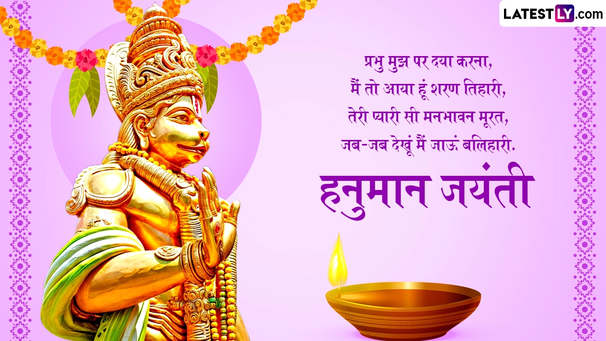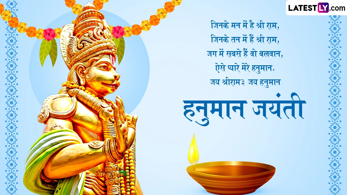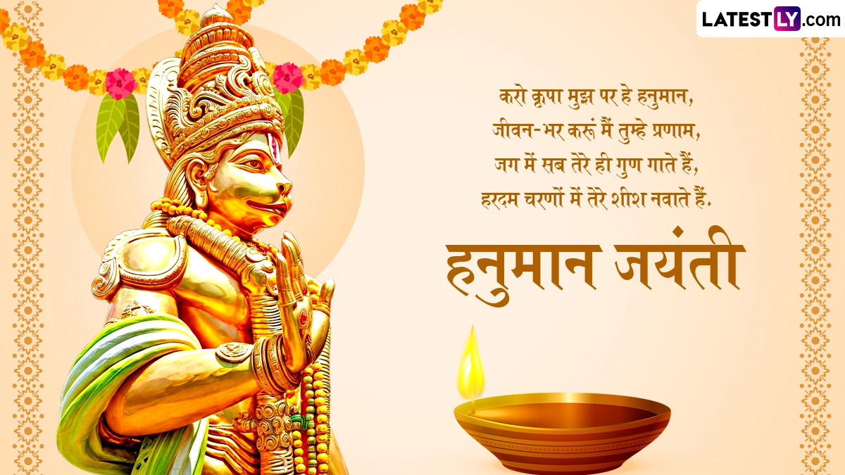 हनुमान जयंती के पावन अवसर पर देशभर के तमाम हनुमान मंदिरों में विशेष पूजा-अर्चना की जाती है. इस दिन मंदिरों और घरों में भक्त हनुमान चालीसा, बजरंग बाण और सुंदरकांड का पाठ करते हैं. इसके साथ ही शुभकामना संदेशों का आदान-प्रदान किया जाता है. ऐसे में इस बेहद खास मौके पर आप इन शानदार हिंदी विशेज, कोट्स, वॉट्सऐप मैसेजेस, जीआईएफ ग्रीटिंग्स को भेजकर अपने प्रियजनों को हनुमान जयंती की शुभकामनाएं दे सकते हैं.