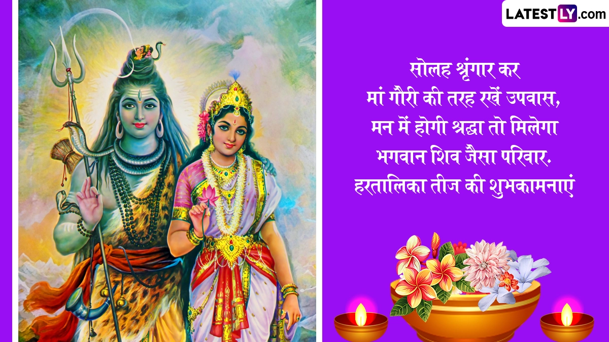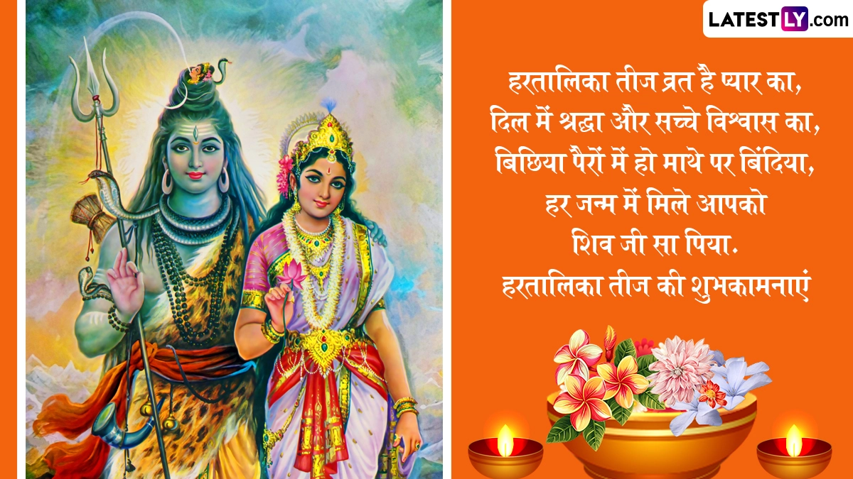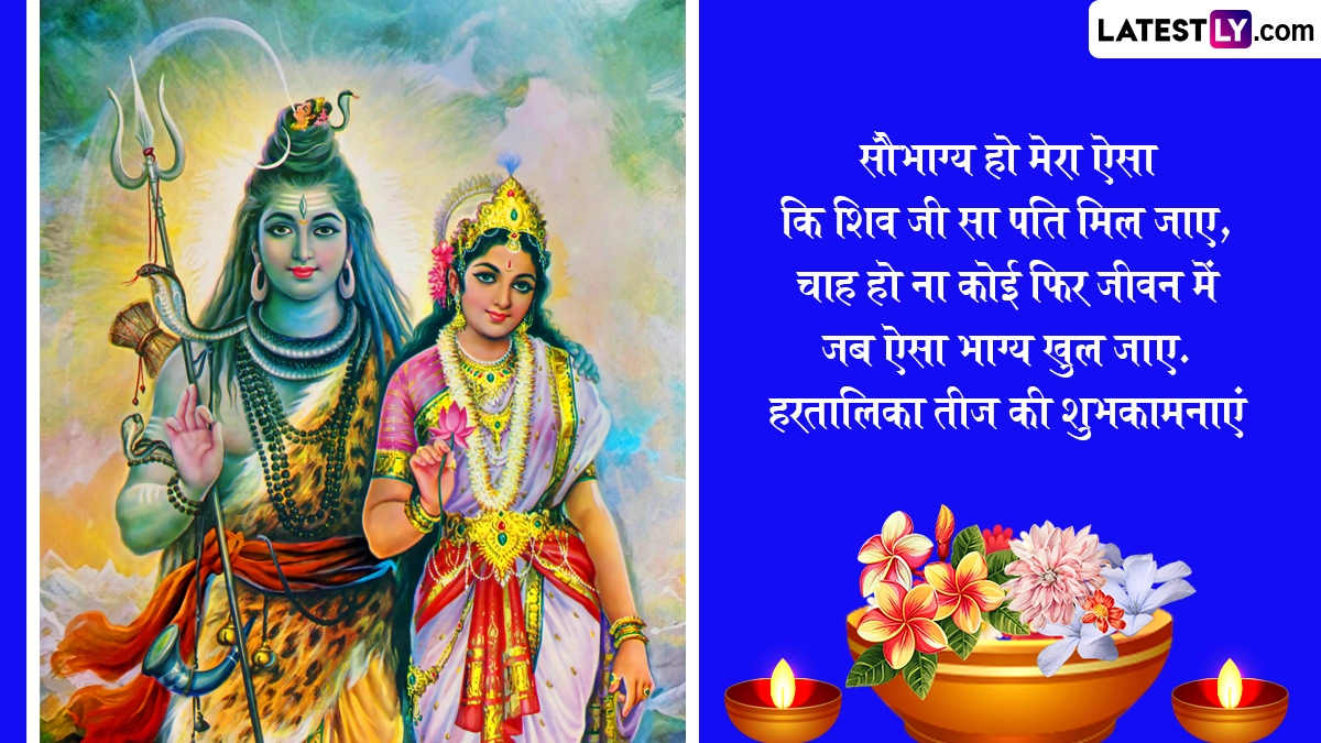 Hartalika Teej 2025 Wishes in Hindi: अखंड सौभाग्य के पर्व हरियाली तीज (Hariyali Teej) और कजरी तीज (Kajari Teej) को मनाए जाने के बाद अब महिलाएं हरतालिका तीज (Hartalika Teej) का पर्व मनाने के लिए तैयार हैं. हिंदू पंचांग के अनुसार, हर साल भाद्रपद मास के शुक्ल पक्ष की तृतीया तिथि को हरतालिका तीज का त्योहार मनाया जाता है. मान्यता है कि इस दिन व्रत रखकर शिव-पार्वती की पूजा करने से विवाहित महिलाओं को अंखड सौभाग्य का वरदान मिलता है, जबकि कुंवारी कन्याओं को मनचाहे वर की प्राप्ति होती है. इस साल की हरतालिका तीज बेहद खास है, क्योंकि इस दिन कई शुभ संयोग बन रहे हैं. ऐसे में इस साल इस व्रत को रखने से महिलाओं को भगवान की विशेष कृपा प्राप्त हो सकती है. उदयातिथि के अनुसार, इस साल 26 अगस्त 2025 को हरतालिका तीज मनाई जा रही है.
