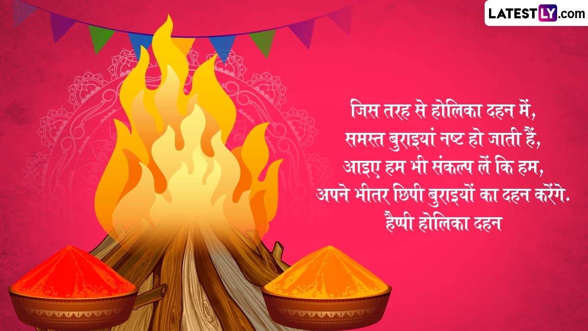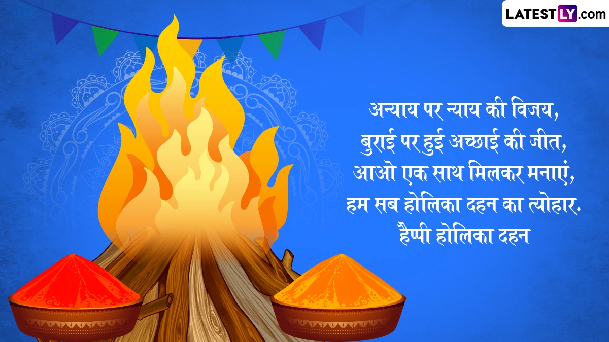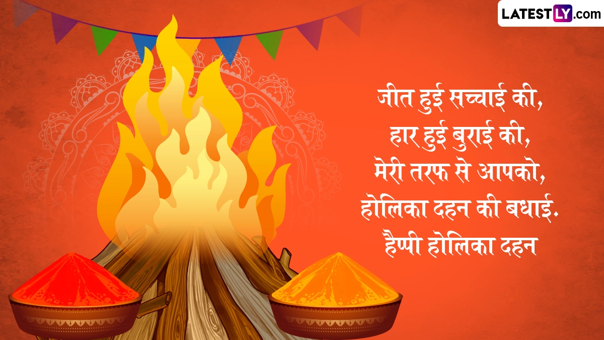 होलिका दहन पर लोग एक-दूसरे को बधाई संदेश भेजकर खुशियां साझा करते हैं. ऐसे में बुराई पर अच्छाई की जीत के प्रतीक छोटी होली के अवसर पर आप भी अपने दोस्तों और रिश्तेदारों को इन चुनिंदा हिंदी मैसेजेस, शायरी, वॉट्सऐप विशेज, जीआईएफ ग्रीटिंग्स के जरिए हैप्पी होलिका दहन कह सकते है, साथ ही इस पर्व की खुशियों को उनके साथ बांट सकते हैं.