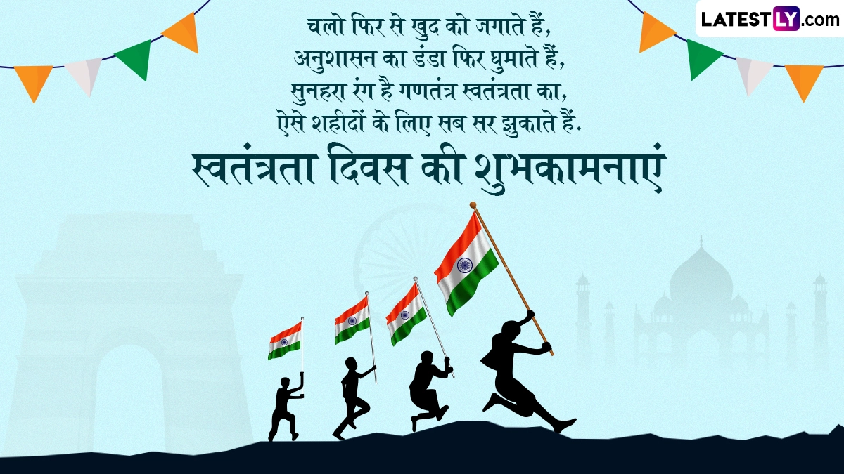 15 अगस्त का दिन हर हिंदुस्तानी के लिए बेहद खास होता है, इसलिए इस दिन को हर कोई उत्सव की तरह पूरे जोश और उत्साह के साथ मनाता है. इस साल भारत अपनी आजादी की 78वीं सालगिरह सेलिब्रेट कर रहा है, जबकि 79वां स्वतंत्रता दिवस मना रहा है. इस बेहद खास अवसर पर आप देशभक्ति वाले इन हिंदी विशेज, कोट्स, वॉट्सऐप मैसेजेस, जीआईएफ ग्रीटिंग्स के जरिए स्वतंत्रता दिवस की अपनों को शुभकामनाएं दे सकते हैं.