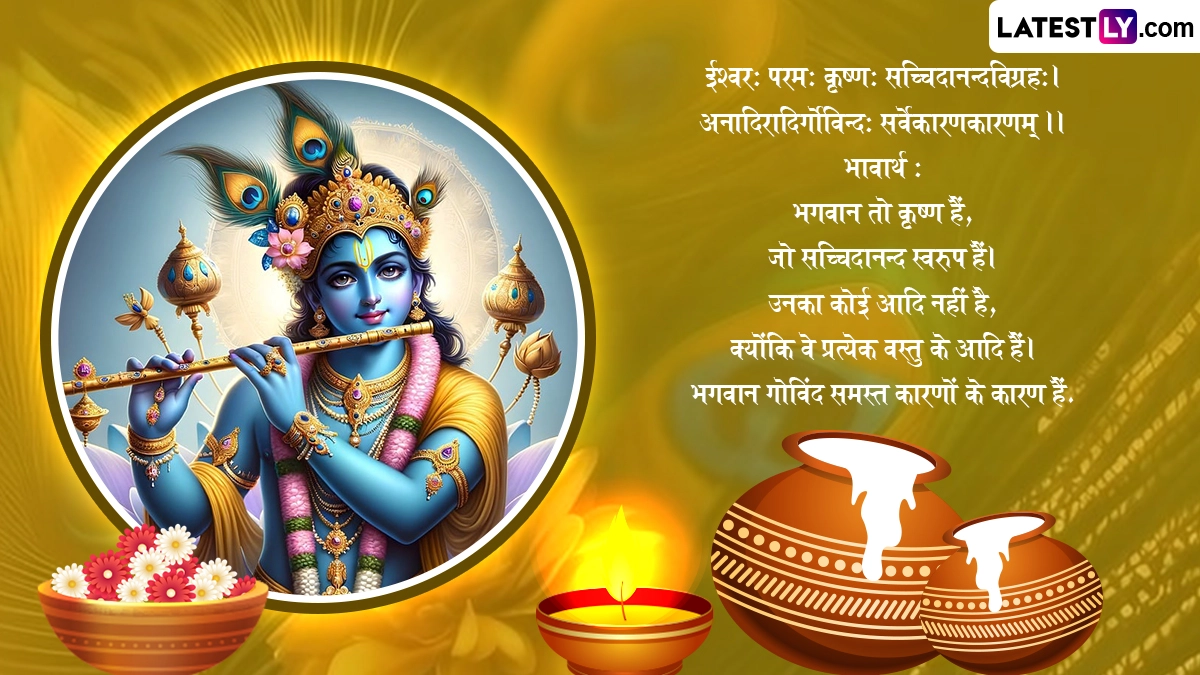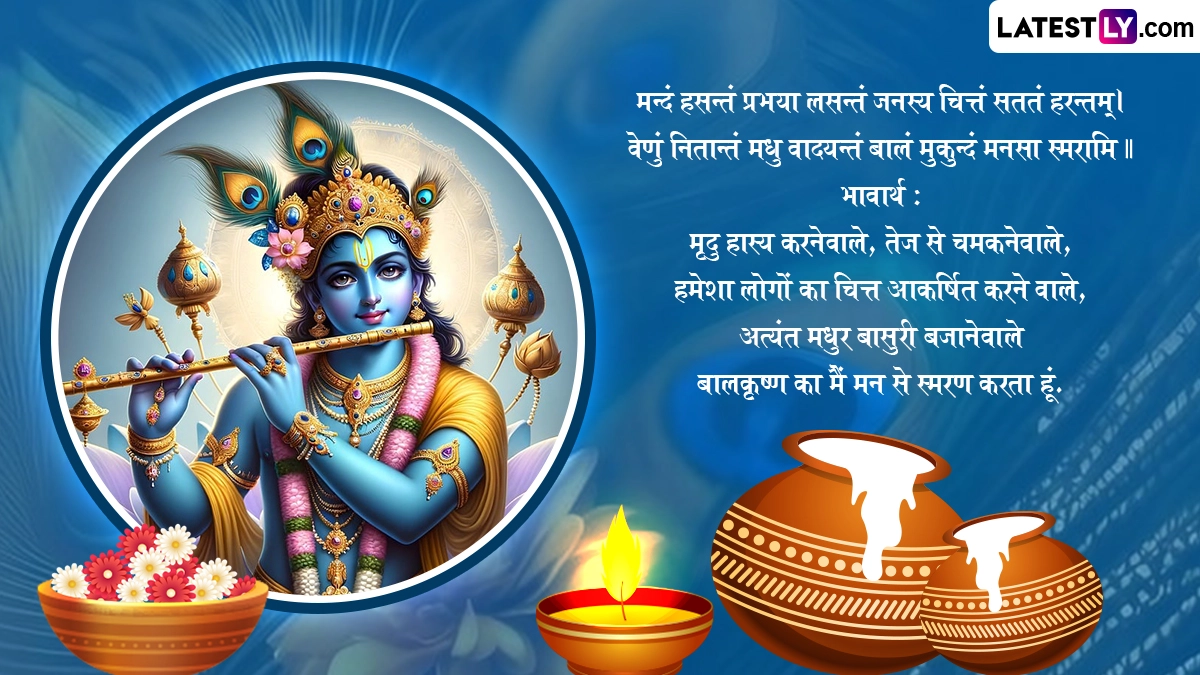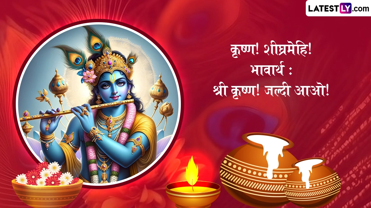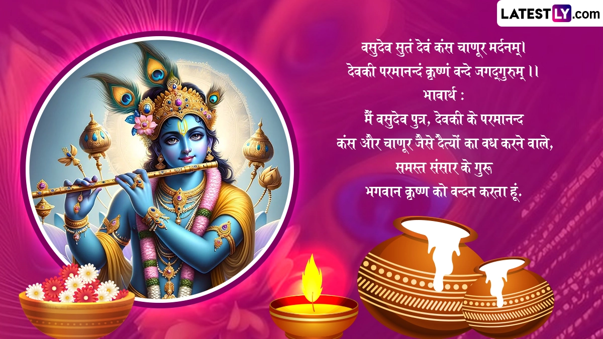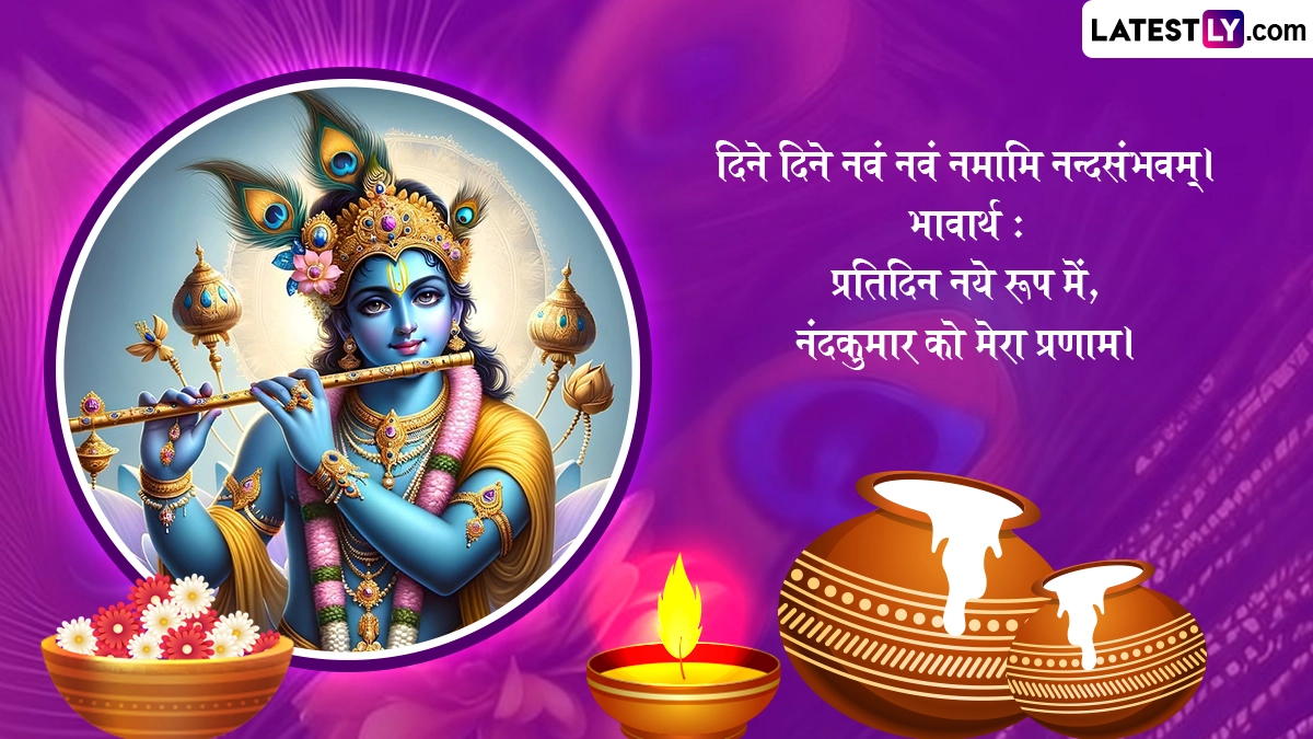 कृष्ण जन्माष्टमी के त्योहार को मनाने के लिए इस दिन घरों और मंदिरों में कान्हा के जन्मोत्सव की सुंदर झाकियां सजाई जाती हैं, भजन-कीर्तन किए जाते हैं. भक्त व्रत रखकर विधि-विधान से कान्हा की पूजा करते हैं, भव्य श्रृंगार कर रात्रि में 12 बजे उनका जन्म कराया जाता है. ऐसे में इस बेहद पावन अवसर पर आप इन शानदार संस्कृत विशेज, श्लोक, वॉट्सऐप स्टेटस, जीआईएफ ग्रीटिंग्स, फोटो एसएमएस को भेजकर शुभकामनाएं दे सकते हैं.