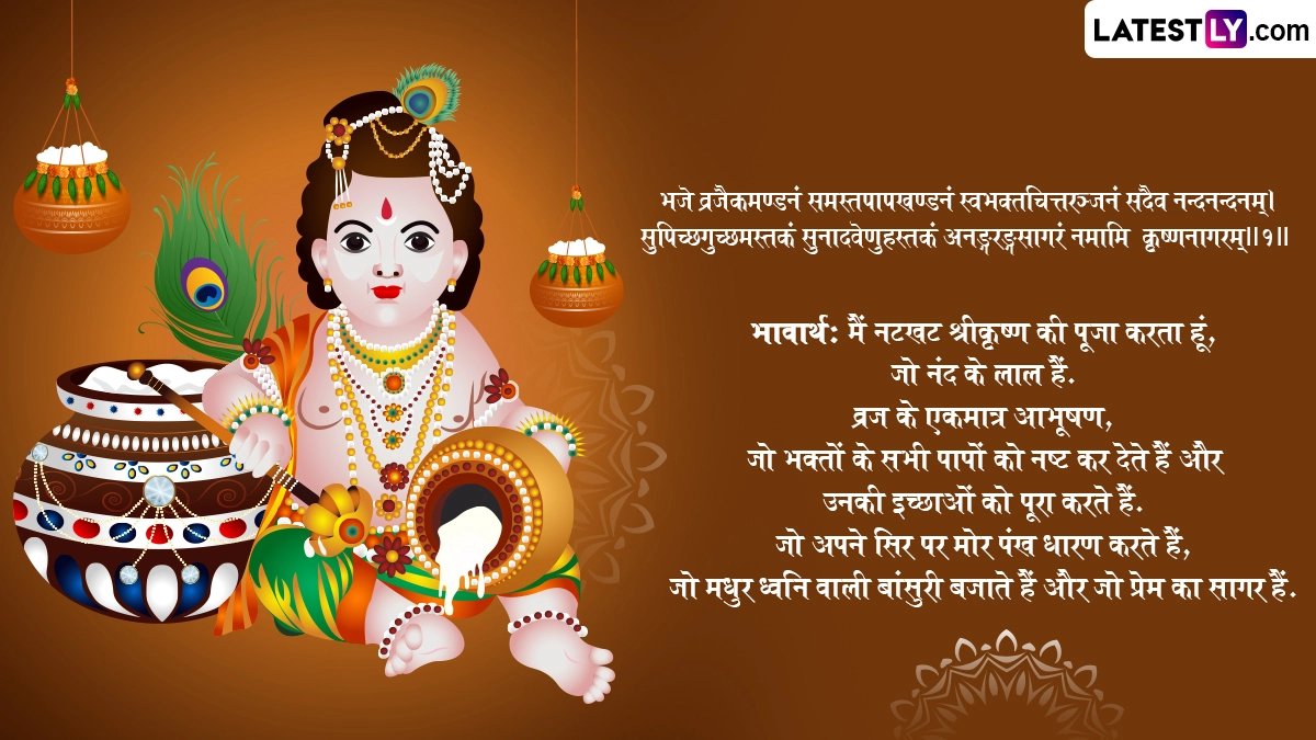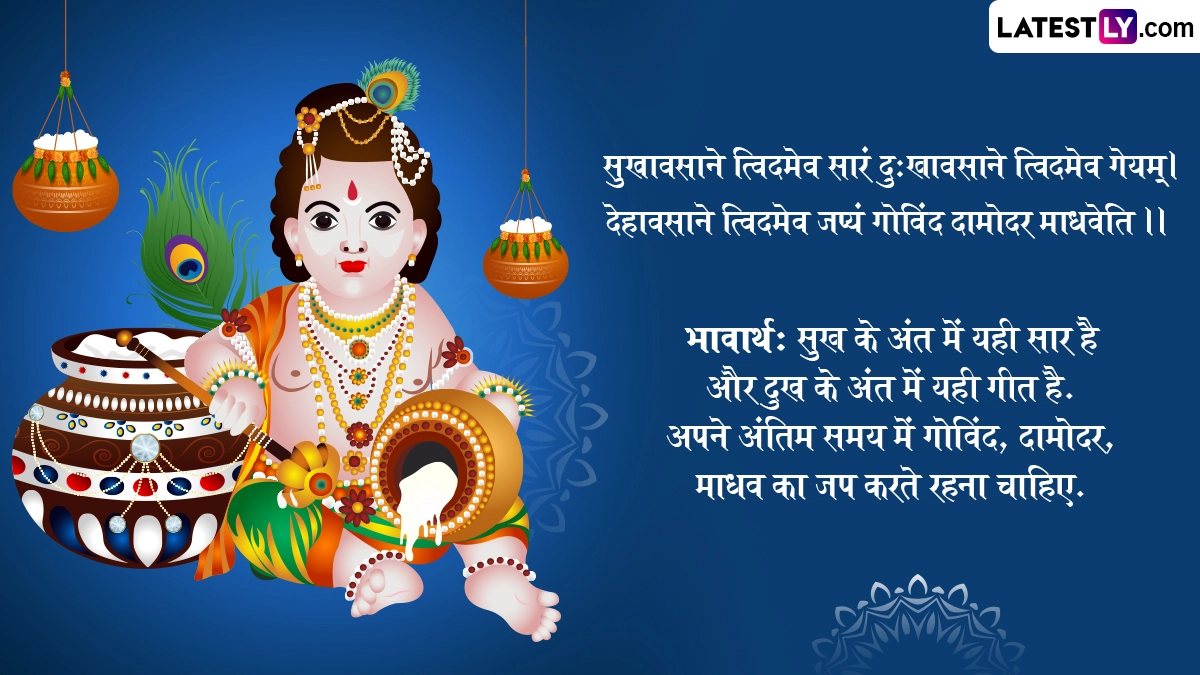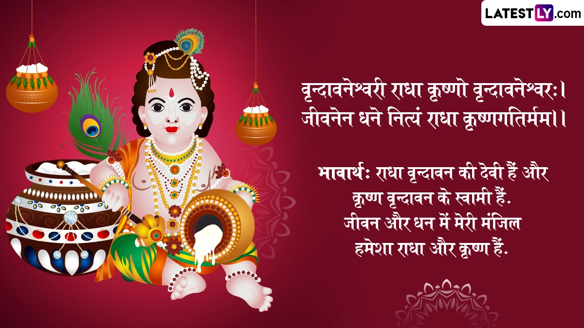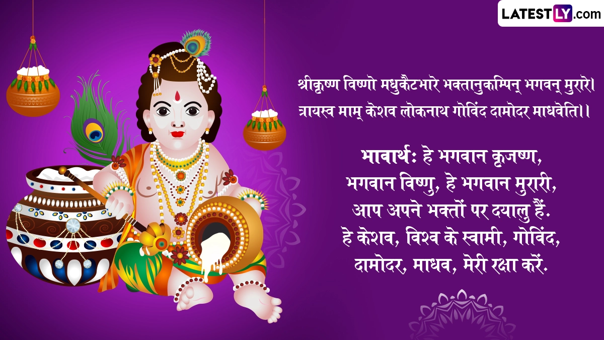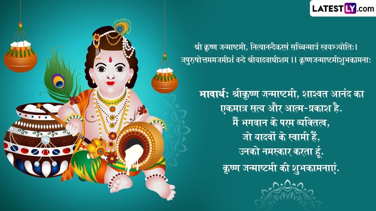 ऐसी मान्यता है कि श्रीकृष्ण जन्माष्टमी के दिन कान्हा की पूजा-अर्चना करने से भक्तों के सारे संकट दूर होते हैं, उनकी समस्त मनोकामनाएं पूरी होती हैं और उनके जीवन में खुशहाली आती है. ऐसे में इस बेहद पावन अवसर पर आप संस्कृत के इन शानदार विशेज, श्लोक, वॉट्सऐप मैसेजेस, फेसबुक ग्रीटिंग्स को शेयर करके प्रियजनों से श्री कृष्णजन्माष्टमी महोत्सवस्य शुभकामनाः कह सकते हैं.