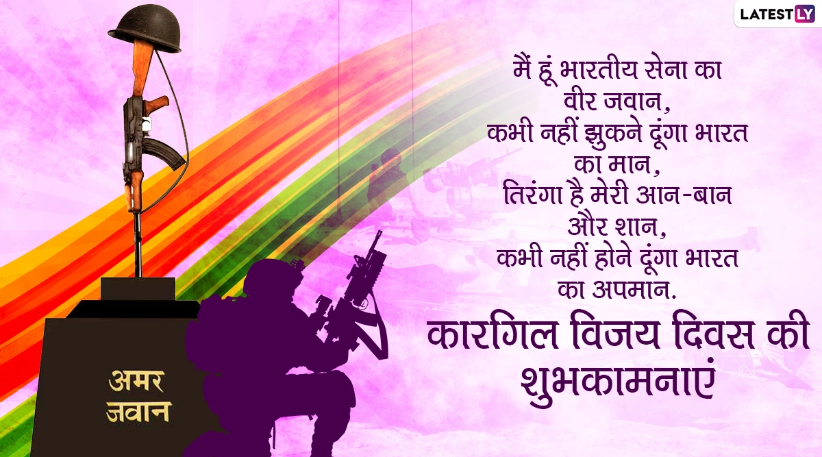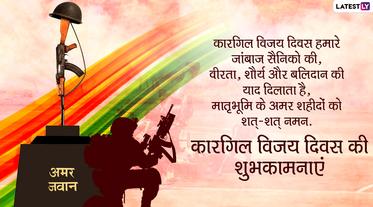 कारगिल विजय दिवस पर देश के जवानों की शहादत को नमन करते हुए समस्त देशवासी उन्हें श्रद्धांजलि अर्पित करते हैं और उन जांबाजों की शौर्य की गाथा सुनाई जाती है. गर्व के इस बेहद खास मौके पर आप भी देशभक्ति की भावना से ओतप्रोत इन शानदार विशेज, कोट्स, मैसेज, जीआईएफ ग्रीटिंग्स, एसएमएस, वॉलपेपर्स को वॉट्सऐप, फेसबुक और ट्विटर के जरिए भेजकर अपने दोस्तों-रिश्तेदारों को शुभकामनाएं दे सकते हैं.