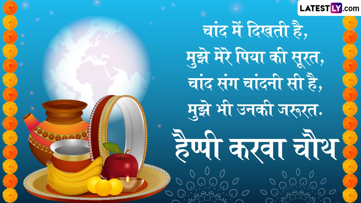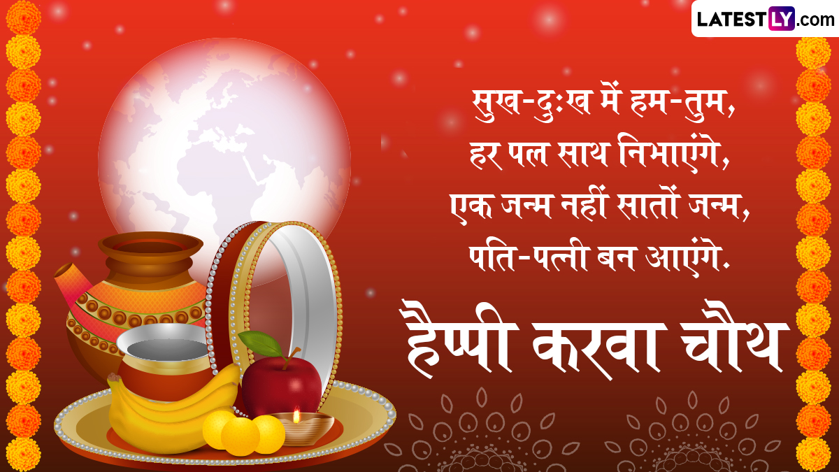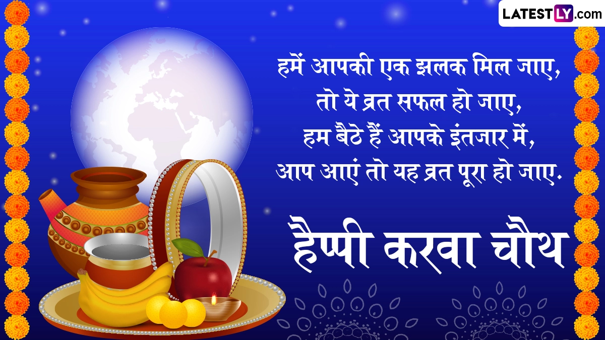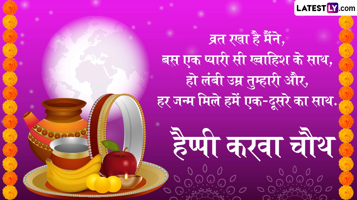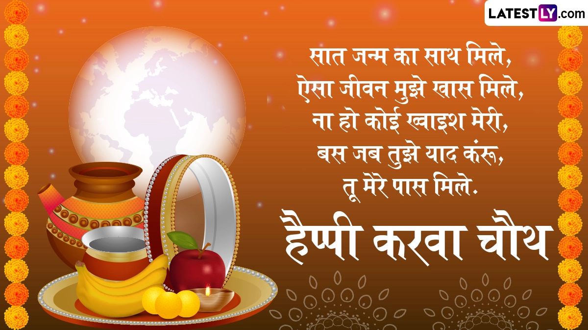 करवा चौथ के दिन महिलाएं दिन भर निर्जल व्रत रखकर सोलह श्रृंगार करके विधि-विधान से पूजा करती हैं. इस दौरान करवा चौथ की कथा सुनी या पढ़ी जाती है, फिर रात में चंद्रोदय के बाद चांद का दीदार करके महिलाएं अपना व्रत पूर्ण करती हैं. इस बेहद खास अवसर पर आप अपनी सखी-सहेलियों के साथ इन हिंदी मैसेजेस, शायरी, वॉट्सऐप विशेज और ग्रीटिंग्स को शेयर करके हैप्पी करवा चौथ कह सकती हैं.