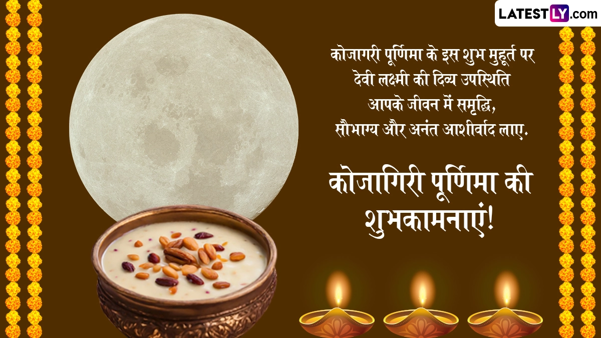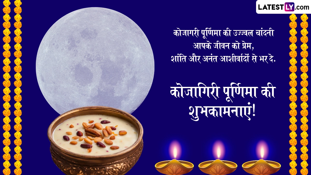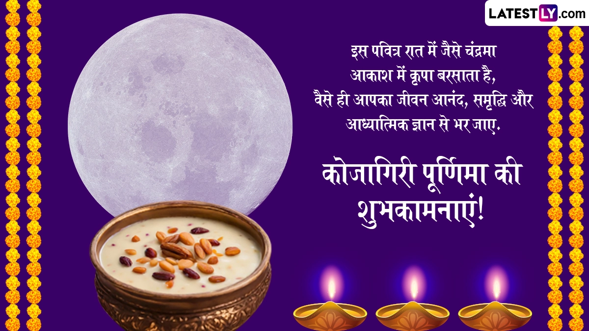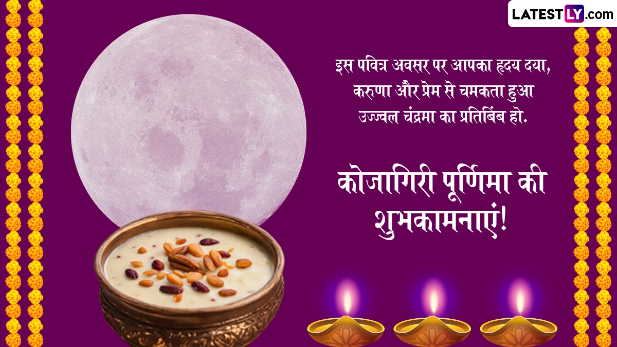 भक्त देवी की पूजा करते हैं, प्रार्थना और अनुष्ठान करते हैं, ताकि उनकी दिव्य कृपा प्राप्त हो और भरपूर फसल सुनिश्चित हो सके. कोजागिरी पूजा कृतज्ञता और श्रद्धा की भावना का प्रतीक है, जो ईश्वर और मानवता के बीच के बंधन को मजबूत करती है. इस वर्ष, कोजागिरी पूर्णिमा 16 अक्टूबर 2024 को मनाई जा रही है. कोजागिरी पूजा एक पवित्र हिंदू त्यौहार है, जो धन और समृद्धि की देवी लक्ष्मी को प्रसन्न करने के लिए समर्पित है. यह शुभ अवसर आश्विन की पूर्णिमा के दिन पड़ता है, जिसे 'जागृति की रात' के रूप में माना जाता है. किंवदंती है कि इस शाम को देवी लक्ष्मी अपने समर्पित अनुयायियों को आशीर्वाद देने के लिए पृथ्वी पर उतरती हैं. भक्त अटूट भक्ति के साथ कोजागरी पूजा करते हैं, देवी लक्ष्मी की पूजा उत्साह और समर्पण के साथ करते हैं. वे समृद्धि, धन और खुशी के लिए उनका आशीर्वाद मांगते हैं. इस अवसर पर आप इन हिंदी मैसेजेस, फोटो एसएमएस, जीआईएफ ग्रीटिंग्स, वॉट्सऐप विशेज, कोट्स के जरिए हैप्पी कोजागरी पूर्णिमा कह सकते हैं.