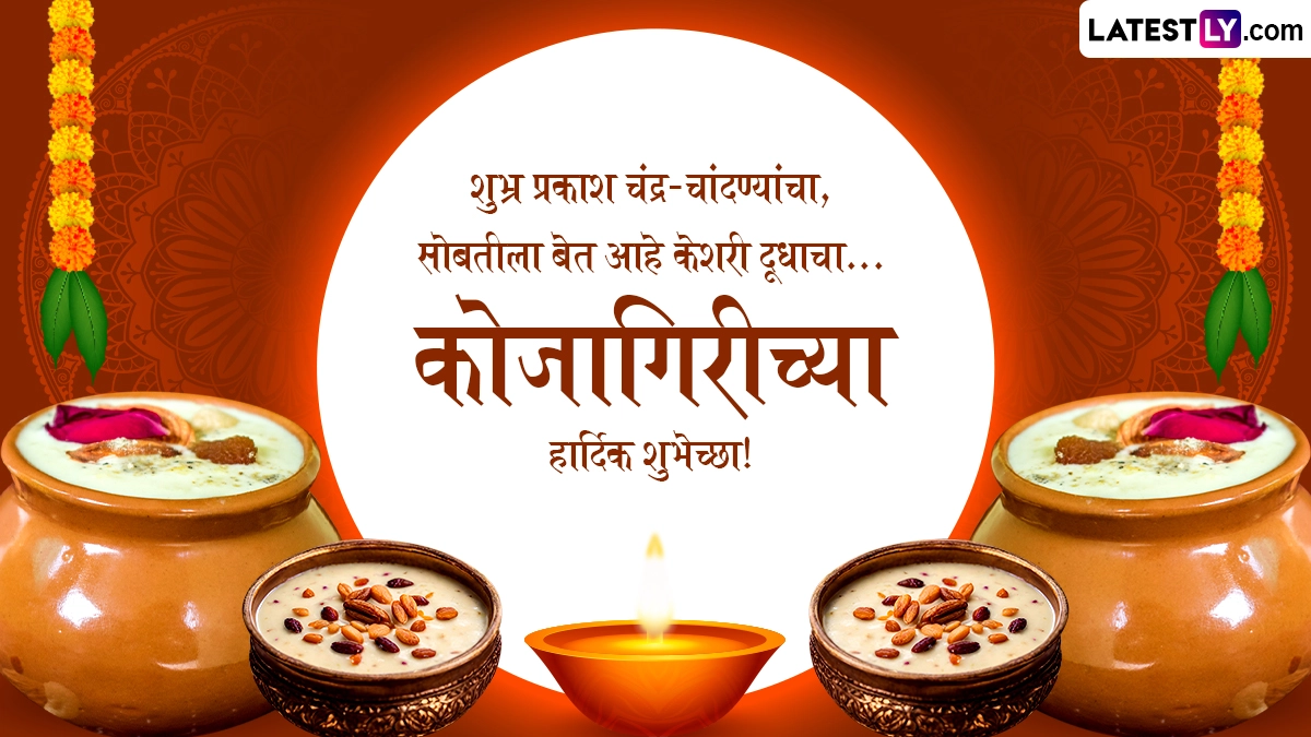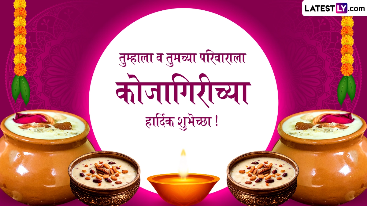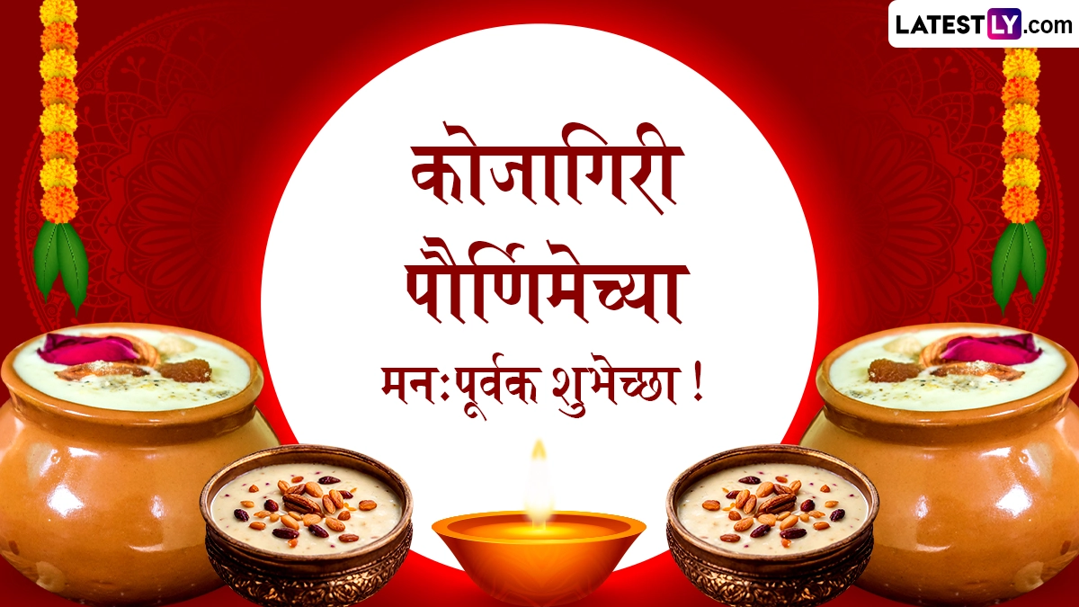 Kojagiri Purnima Marathi Shubhechha: कोजागिरी पूर्णिमा (Kojagiri Purnima) आज सोम्ब्वार 6 अक्टूबर को मनाई जा रही है, इसे शरद पूर्णिमा (Sharad Purnima) या रास पूर्णिमा और आश्विन पूर्णिमा भी कहा जाता है. इस दिन का बहुत महत्व है. यह पर्व भक्ति, समृद्धि और चांदनी के दिव्य संगम का प्रतीक है. पूर्णिमा तिथि का प्रारंभ 6 अक्टूबर को दोपहर 12:23 बजे से होकर 7 अक्टूबर को सुबह 9:16 बजे तक रहेगा. परंपरागत रूप से, पूजा रात्रिकाल में की जाती है, इसलिए कोजागिरी लक्ष्मी पूजन 6 अक्टूबर की रात को ही होगा. कोजागिरी पूर्णिमा के दिन चावल वाली खीर खाने का बहुत महत्व है. रात में खीर बनाने के बाद आकाश के नीचे इसे भीगने दिया जाता है. मान्यता है कि शरद पूर्णिमा की रात चंद्रमा से अमृत की वर्षा होती है, और इस चांदनी में भीगी खीर औषधीय गुणों से भर जाती है. अगले दिन, यह खीर प्रसाद के रूप में ग्रहण खायी जाती है, जो स्वास्थ्य, धन और लंबी आयु का प्रतीक मानी जाती है. यह भी पढ़ें: Sharad Purnima 2025 Messages: हैप्पी शरद पूर्णिमा! अपनों संग शेयर करें ये हिंदी Shayaris, WhatsApp Wishes, Quotes और Facebook Greetings